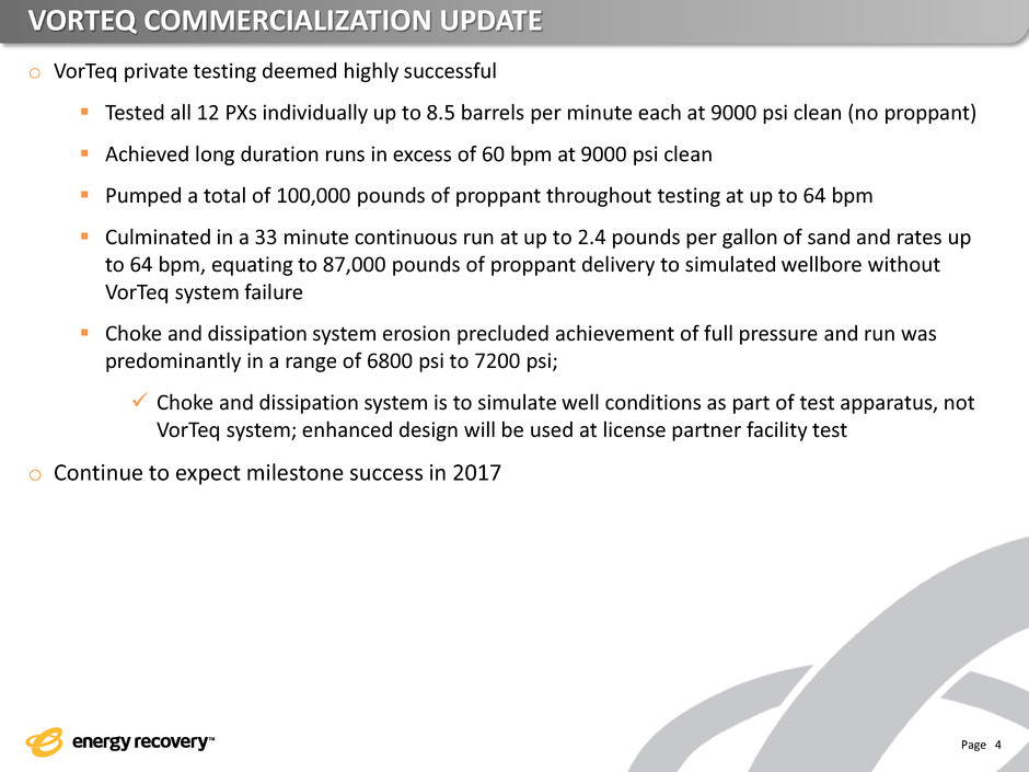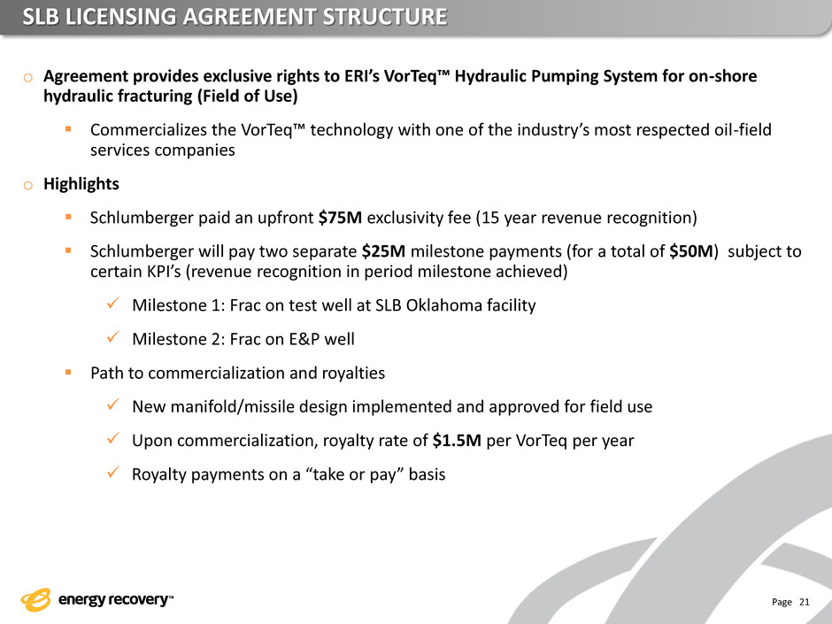 o Agreement provides exclusive rights to ERI’s VorTeq™ Hydraulic Pumping System for on-shore