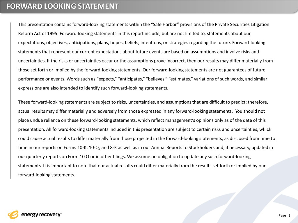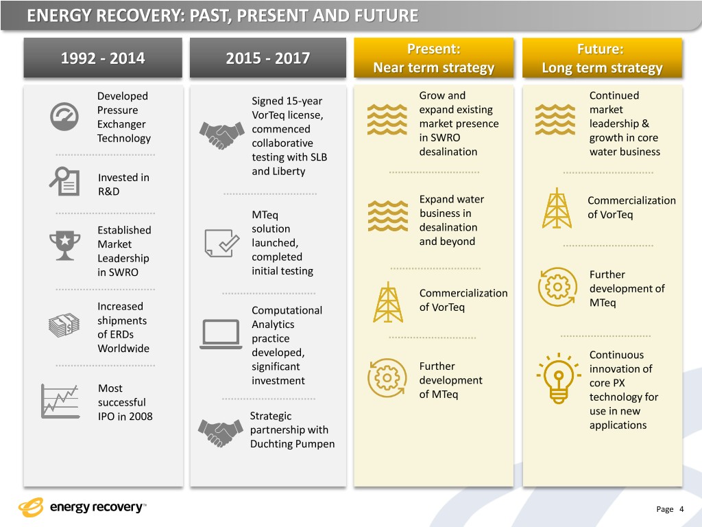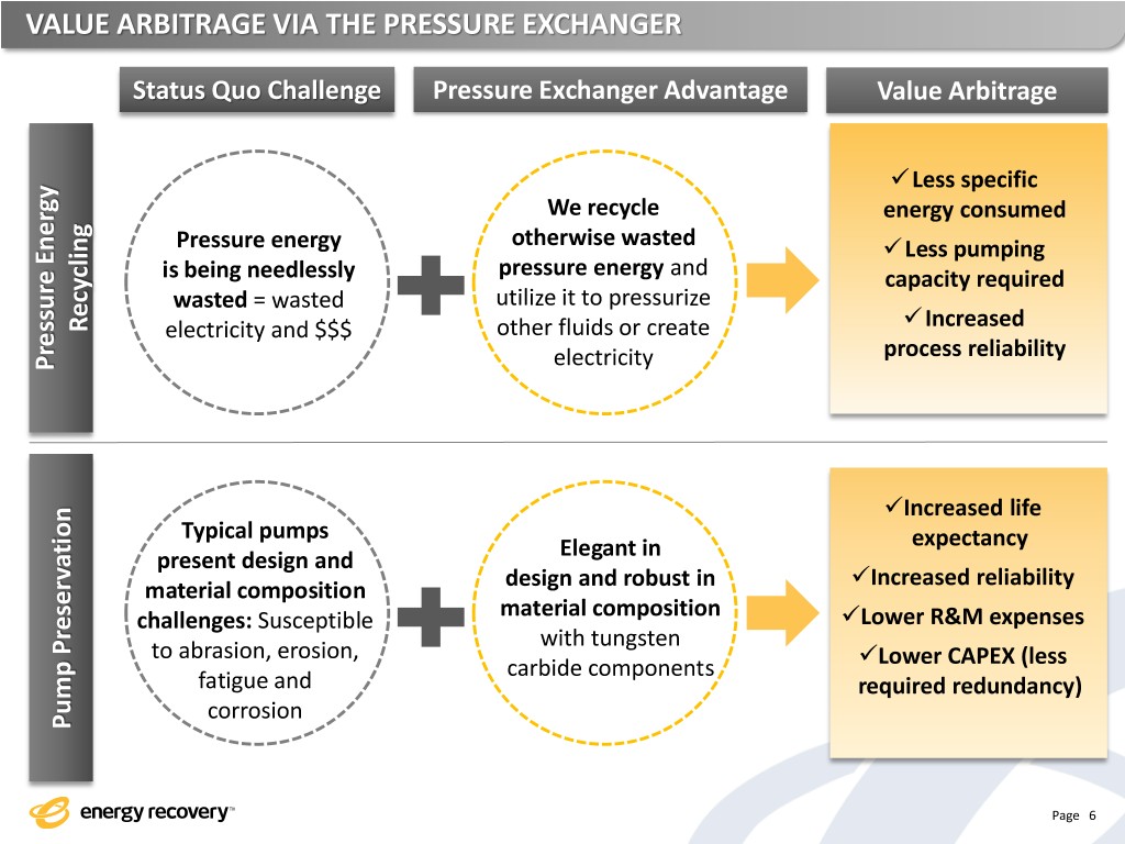 ENERGY RECOVERY SNAPSHOT Who We Are An energy solutions provider and technology leader in applying fluid dynamics and advanced materials science Pressure Energy is our Arbitrage What We Do/Product Strategy ▪ Preserve or eliminate pumps that are subject to and destroyed by hostile process fluids ▪ Convert wasted pressure energy into a reusable asset Page 3