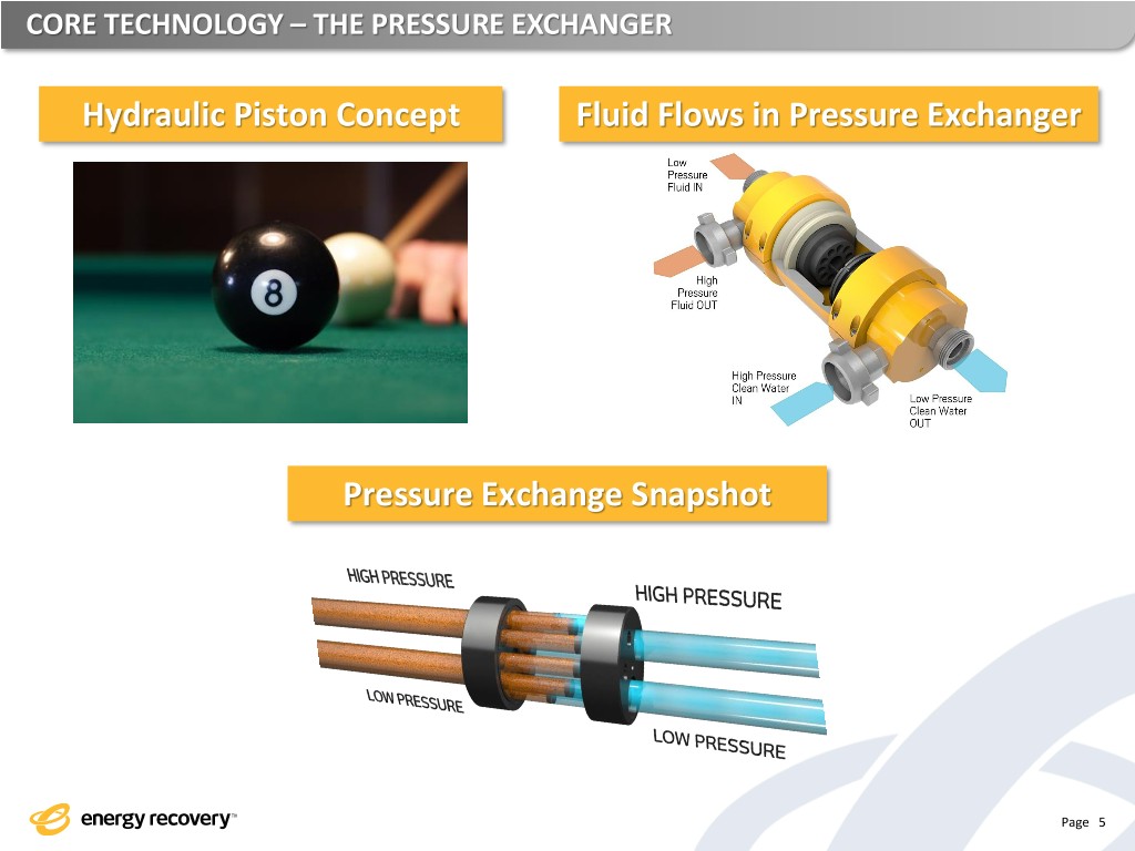 CORE TECHNOLOGY – THE PRESSURE EXCHANGER Hydraulic Piston Concept Fluid Flows in Pressure Exchanger Pressure Exchange Snapshot Page 5