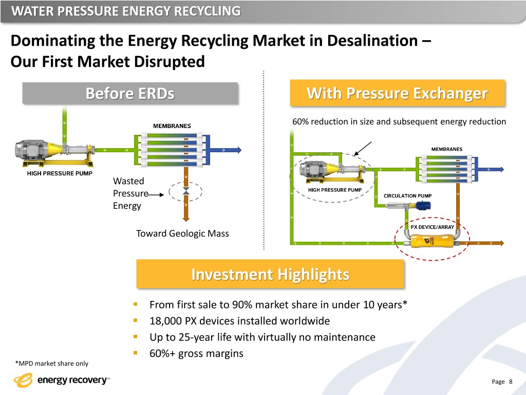 WATER PRESSURE ENERGY RECYCLING Dominating the Energy Recycling Market in Desalination – Our First Market Disrupted Before ERDs With Pressure Exchanger 60% reduction in size and subsequent energy reduction Wasted Pressure Energy Toward Geologic Mass Investment Highlights ▪ From first sale to 90% market share in under 10 years* ▪ 18,000 PX devices installed worldwide ▪ Up to 25-year life with virtually no maintenance ▪ 60%+ gross margins *MPD market share only Page 8