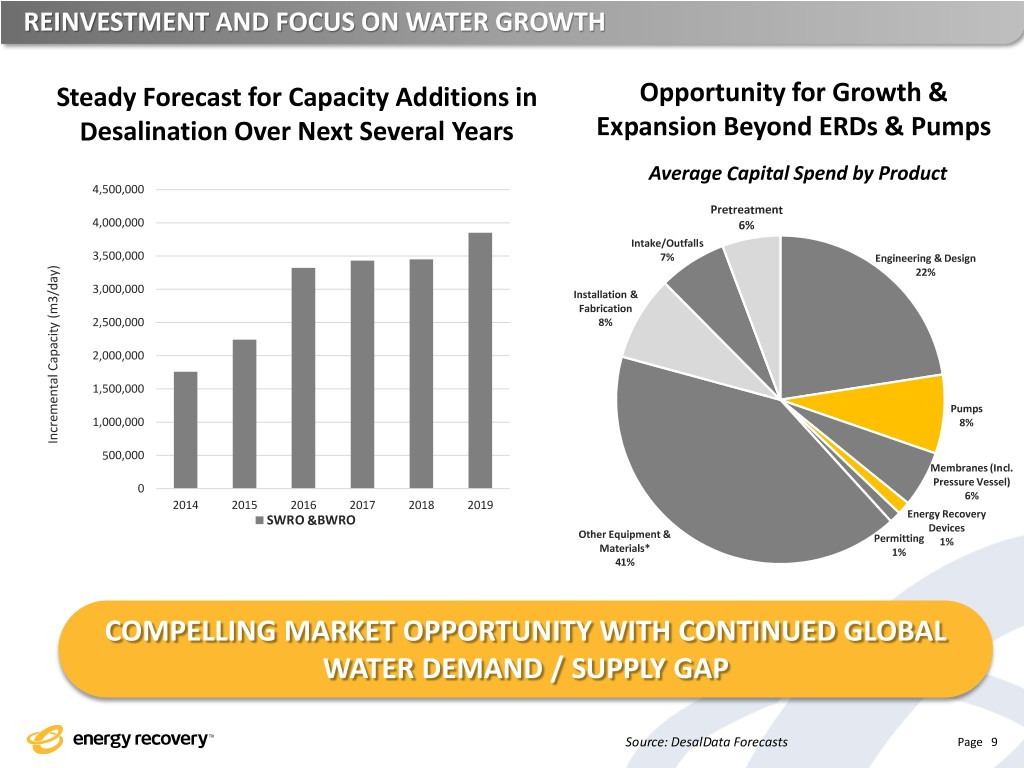REINVESTMENT AND FOCUS ON WATER GROWTH Steady Forecast for Capacity Additions in Opportunity for Growth & Desalination Over Next Several Years Expansion Beyond ERDs & Pumps Average Capital Spend by Product 4,500,000 Pretreatment 4,000,000 6% Intake/Outfalls 3,500,000 7% Engineering & Design 22% 3,000,000 Installation & Fabrication 2,500,000 8% 2,000,000 1,500,000 Pumps 1,000,000 8% Incremental Incremental Capacity(m3/day) 500,000 Membranes (Incl. Pressure Vessel) 0 6% 2014 2015 2016 2017 2018 2019 SWRO &BWRO Energy Recovery Devices Other Equipment & Permitting 1% Materials* 1% 41% COMPELLING MARKET OPPORTUNITY WITH CONTINUED GLOBAL WATER DEMAND / SUPPLY GAP Source: DesalData Forecasts Page 9