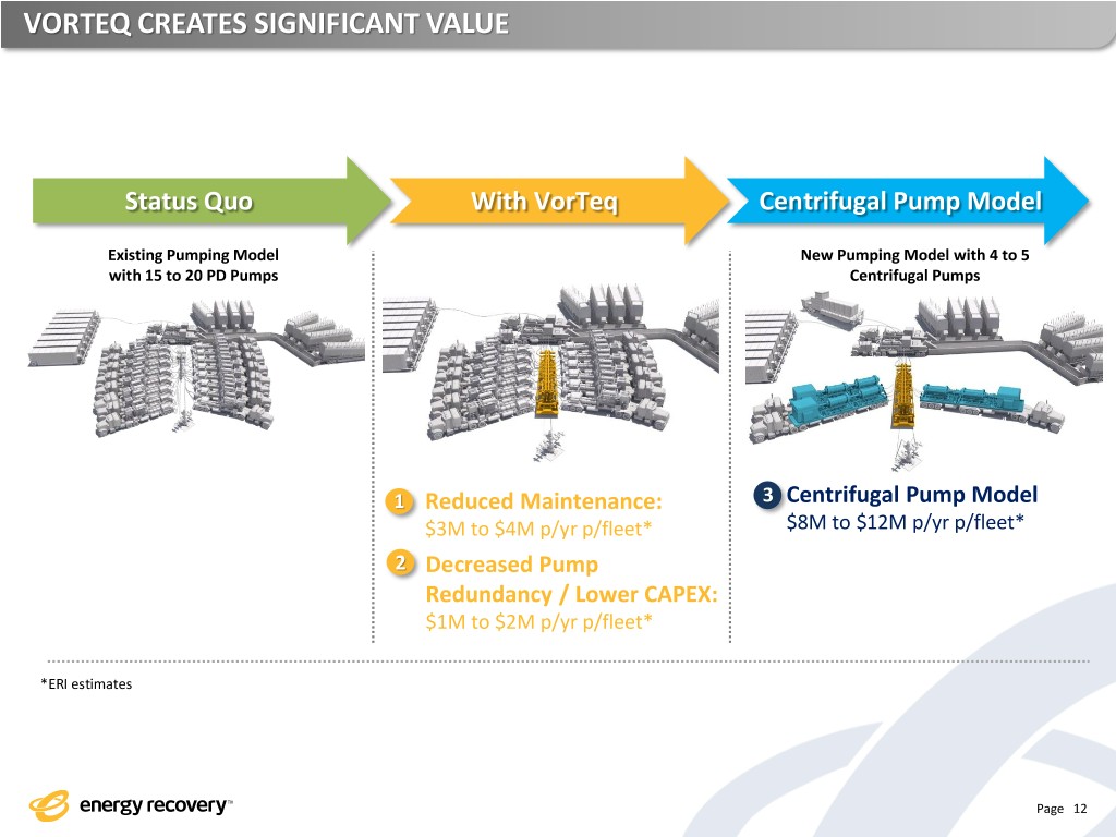 VORTEQ CREATES SIGNIFICANT VALUE Status Quo With VorTeq Centrifugal Pump Model Existing Pumping Model New Pumping Model with 4 to 5 with 15 to 20 PD Pumps Centrifugal Pumps 1 Reduced Maintenance: 3 Centrifugal Pump Model $3M to $4M p/yr p/fleet* $8M to $12M p/yr p/fleet* 2 Decreased Pump Redundancy / Lower CAPEX: $1M to $2M p/yr p/fleet* *ERI estimates Page 12