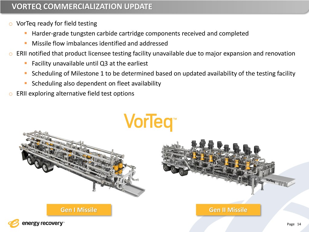 VORTEQ AGREEMENT & COMMERCIALIZATION PATH o VorTeq Commercialization is twofold: ▪ ERII entered into a license agreement with Schlumberger Technology Corporation – one of the industry’s most respected oil-field services companies ✓ Exclusive rights to ERII’s VorTeq for on-shore hydraulic fracturing ➢ Upfront $75M exclusivity fee ➢ Two separate $25M milestone payments (for a total of $50M) subject to certain KPI’s • Milestone 1: Frac at product licensee test facility • Milestone 2: Frac on E&P well ✓ Commercialization Highlights: ➢ Acceptance standards inclusive of M1 & M2 as well as other performance tests ➢ Product licensee responsible for missile manufacturing, ERII provides PXs, housing and motors ➢ Five years from first unit to full deployment in product licensee fleets ➢ $1.5MM per VorTeq per year ▪ Liberty Oilfield Services carve-out (ERII’s early-stage test partner) ✓ Rights for up to 20 VorTeq units for up to 5 years ✓ ERII provides full missile and cartridges – vendors have been qualified ✓ Commercialization standards differ and thus speed to market may be faster ✓ Pricing based on contractual ROIC Page 13