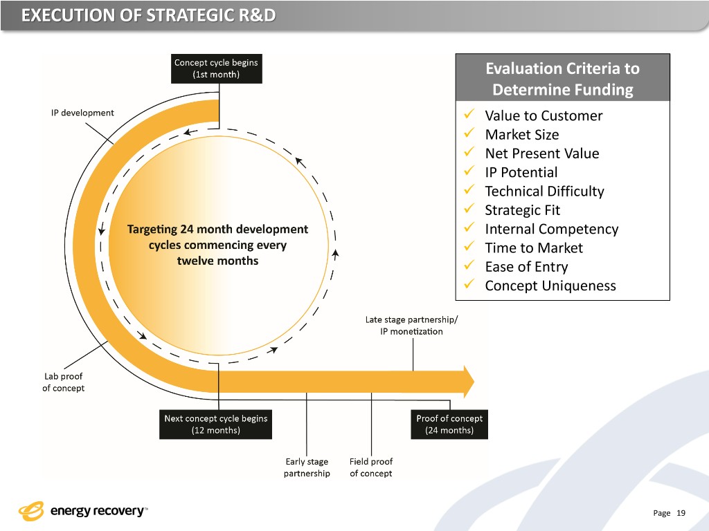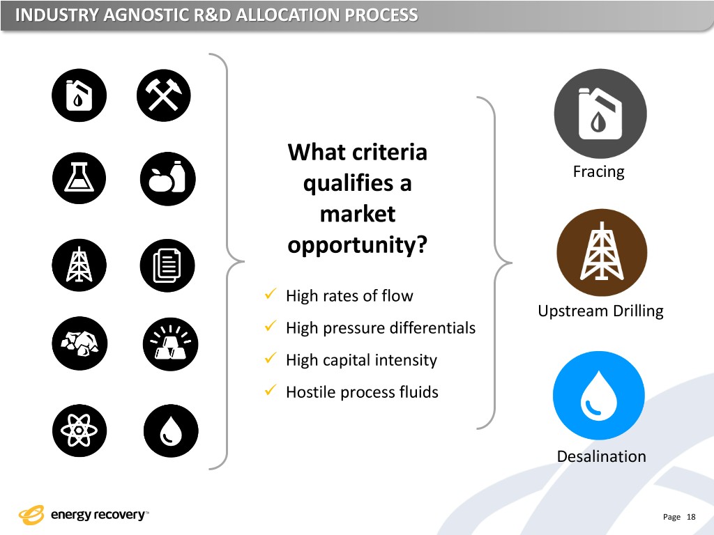 INDUSTRY AGNOSTIC R&D ALLOCATION PROCESS What criteria qualifies a Fracing market opportunity? ✓ High rates of flow Upstream Drilling ✓ High pressure differentials ✓ High capital intensity ✓ Hostile process fluids Desalination Page 18