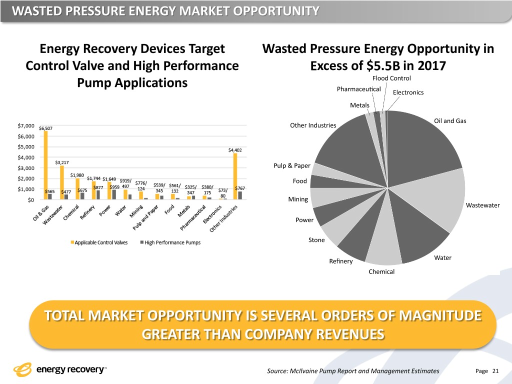 WASTED PRESSURE ENERGY MARKET OPPORTUNITY Energy Recovery Devices Target Wasted Pressure Energy Opportunity in Control Valve and High Performance Excess of $5.5B in 2017 Pump Applications TOTAL MARKET OPPORTUNITY IS SEVERAL ORDERS OF MAGNITUDE GREATER THAN COMPANY REVENUES Source: McIlvaine Pump Report and Management Estimates Page 21