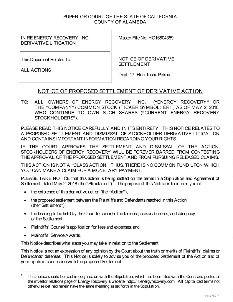 SUPERIOR COURT OF THE STATE OF CALIFORNIA COUNTY OF ALAMEDA IN RE ENERGY RECOVERY, INC. Master File No. HG16804359 DERIVATIVE LITIGATION This Document Relates To: NOTICE OF DERIVATIVE SETTLEMENT ALL ACTIONS Dept. 17: Hon. Ioana Petrou NOTICE OF PROPOSED SETTLEMENT OF DERIVATIVE ACTION TO: ALL OWNERS OF ENERGY RECOVERY, INC. (“ENERGY RECOVERY” OR THE “COMPANY”) COMMON STOCK (TICKER SYMBOL: ERII) AS OF MAY 2, 2018, WHO CONTINUE TO OWN SUCH SHARES (“CURRENT ENERGY RECOVERY STOCKHOLDERS”). PLEASE READ THIS NOTICE CAREFULLY AND IN ITS ENTIRETY. THIS NOTICE RELATES TO A PROPOSED SETTLEMENT AND DISMISSAL OF STOCKHOLDER DERIVATIVE LITIGATION AND CONTAINS IMPORTANT INFORMATION REGARDING YOUR RIGHTS. IF THE COURT APPROVES THE SETTLEMENT AND DISMISSAL OF THE ACTION, STOCKHOLDERS OF ENERGY RECOVERY WILL BE FOREVER BARRED FROM CONTESTING THE APPROVAL OF THE PROPOSED SETTLEMENT AND FROM PURSUING RELEASED CLAIMS. THIS ACTION IS NOT A “CLASS ACTION.” THUS, THERE IS NO COMMON FUND UPON WHICH YOU CAN MAKE A CLAIM FOR A MONETARY PAYMENT. PLEASE TAKE NOTICE that this action is being settled on the terms in a Stipulation and Agreement of Settlement, dated May 2, 2018 (the “Stipulation”).1 The purpose of this Notice is to inform you of: the existence of this derivative action (the “Action”), the proposed settlement between the Plaintiffs and Defendants reached in this Action (the “Settlement”), the hearing to be held by the Court to consider the fairness, reasonableness, and adequacy of the Settlement, Plaintiffs’ Counsel’s application for fees and expenses, and Plaintiffs’ Service Awards. This Notice describes what steps you may take in relation to the Settlement. This Notice is not an expression of any opinion by the Court about the truth or merits of Plaintiffs’ claims or Defendants’ defenses. This Notice is solely to advise you of the proposed Settlement of the Action and of your rights in connection with the proposed Settlement. 1 This notice should be read in conjunction with the Stipulation, which has been filed with the Court and posted at the investor relations page of Energy Recovery’s website, http://ir.energyrecovery.com. All capitalized terms not otherwise defined herein have the same meaning as set forth in the Stipulation. ENYNOT1