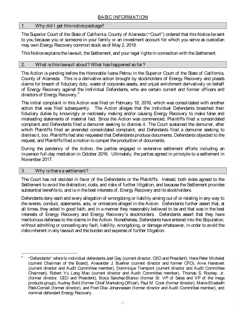 BASIC INFORMATION 1. Why did I get this notice package? The Superior Court of the State of California, County of Alameda (“Court”) ordered that this Notice be sent to you because you or someone in your family or an investment account for which you serve as custodian may own Energy Recovery common stock as of May 2, 2018. This Notice explains the lawsuit, the Settlement, and your legal rights in connection with the Settlement. 2. What is this lawsuit about? What has happened so far? The Action is pending before the Honorable Ioana Petrou in the Superior Court of the State of California, County of Alameda. This is a derivative action brought by stockholders of Energy Recovery and pleads claims for breach of fiduciary duty, waste of corporate assets, and unjust enrichment derivatively on behalf of Energy Recovery against the Individual Defendants, who are certain current and former officers and directors of Energy Recovery.2 The initial complaint in this Action was filed on February 18, 2016, which was consolidated with another action that was filed subsequently. The Action alleges that the Individual Defendants breached their fiduciary duties by knowingly or recklessly making and/or causing Energy Recovery to make false and misleading statements of material fact. Since the Action was commenced, Plaintiffs filed a consolidated complaint and Defendants filed a demurrer seeking to dismiss it. The Court sustained the demurrer, after which Plaintiffs filed an amended consolidated complaint, and Defendants filed a demurrer seeking to dismiss it, too. Plaintiffs had also requested that Defendants produce documents. Defendants objected to the request, and Plaintiffs filed a motion to compel the production of documents. During the pendency of the Action, the parties engaged in extensive settlement efforts including an in-person full-day mediation in October 2016. Ultimately, the parties agreed in principle to a settlement in November 2017. 3. Why is there a settlement? The Court has not decided in favor of the Defendants or the Plaintiffs. Instead, both sides agreed to the Settlement to avoid the distraction, costs, and risks of further litigation, and because the Settlement provides substantial benefits to, and is in the best interests of, Energy Recovery and its stockholders. Defendants deny each and every allegation of wrongdoing or liability arising out of or relating in any way to the events, conduct, statements, acts, or omissions alleged in the Action. Defendants further assert that, at all times, they acted in good faith, and in a manner they reasonably believed to be and that was in the best interests of Energy Recovery and Energy Recovery’s stockholders. Defendants assert that they have meritorious defenses to the claims in the Action. Nonetheless, Defendants have entered into the Stipulation, without admitting or conceding any fault, liability, wrongdoing, or damage whatsoever, in order to avoid the risks inherent in any lawsuit and the burden and expense of further litigation. 2 “Defendants” refers to individual defendants Joel Gay (current director, CEO and President), Hans Peter Michelet (current Chairman of the Board), Alexander J. Buehler (current director and former CFO), Arve Hanstveit (current director and Audit Committee member), Dominique Trempont (current director and Audit Committee Chairman), Robert Yu Lang Mao (current director and Audit Committee member), Thomas S. Rooney, Jr. (former director, CEO and President), Borja Sanchez-Blanco (former Sr. VP of Sales and VP of the mega products group), Audrey Bold (former Chief Marketing Officer), Paul M. Cook (former director), Marie-Elisabeth Paté-Cornell (former director), and Fred Olav Johannessen (former director and Audit Committee member), and nominal defendant Energy Recovery. - 2 -