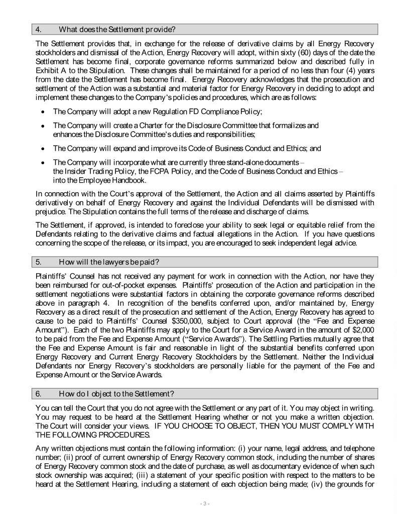 4. What does the Settlement provide? The Settlement provides that, in exchange for the release of derivative claims by all Energy Recovery stockholders and dismissal of the Action, Energy Recovery will adopt, within sixty (60) days of the date the Settlement has become final, corporate governance reforms summarized below and described fully in Exhibit A to the Stipulation. These changes shall be maintained for a period of no less than four (4) years from the date the Settlement has become final. Energy Recovery acknowledges that the prosecution and settlement of the Action was a substantial and material factor for Energy Recovery in deciding to adopt and implement these changes to the Company’s policies and procedures, which are as follows: The Company will adopt a new Regulation FD Compliance Policy; The Company will create a Charter for the Disclosure Committee that formalizes and enhances the Disclosure Committee’s duties and responsibilities; The Company will expand and improve its Code of Business Conduct and Ethics; and The Company will incorporate what are currently three stand-alone documents – the Insider Trading Policy, the FCPA Policy, and the Code of Business Conduct and Ethics – into the Employee Handbook. In connection with the Court’s approval of the Settlement, the Action and all claims asserted by Plaintiffs derivatively on behalf of Energy Recovery and against the Individual Defendants will be dismissed with prejudice. The Stipulation contains the full terms of the release and discharge of claims. The Settlement, if approved, is intended to foreclose your ability to seek legal or equitable relief from the Defendants relating to the derivative claims and factual allegations in the Action. If you have questions concerning the scope of the release, or its impact, you are encouraged to seek independent legal advice. 5. How will the lawyers be paid? Plaintiffs’ Counsel has not received any payment for work in connection with the Action, nor have they been reimbursed for out-of-pocket expenses. Plaintiffs’ prosecution of the Action and participation in the settlement negotiations were substantial factors in obtaining the corporate governance reforms described above in paragraph 4. In recognition of the benefits conferred upon, and/or maintained by, Energy Recovery as a direct result of the prosecution and settlement of the Action, Energy Recovery has agreed to cause to be paid to Plaintiffs’ Counsel $350,000, subject to Court approval (the “Fee and Expense Amount”). Each of the two Plaintiffs may apply to the Court for a Service Award in the amount of $2,000 to be paid from the Fee and Expense Amount (“Service Awards”). The Settling Parties mutually agree that the Fee and Expense Amount is fair and reasonable in light of the substantial benefits conferred upon Energy Recovery and Current Energy Recovery Stockholders by the Settlement. Neither the Individual Defendants nor Energy Recovery’s stockholders are personally liable for the payment of the Fee and Expense Amount or the Service Awards. 6. How do I object to the Settlement? You can tell the Court that you do not agree with the Settlement or any part of it. You may object in writing. You may request to be heard at the Settlement Hearing whether or not you make a written objection. The Court will consider your views. IF YOU CHOOSE TO OBJECT, THEN YOU MUST COMPLY WITH THE FOLLOWING PROCEDURES. Any written objections must contain the following information: (i) your name, legal address, and telephone number; (ii) proof of current ownership of Energy Recovery common stock, including the number of shares of Energy Recovery common stock and the date of purchase, as well as documentary evidence of when such stock ownership was acquired; (iii) a statement of your specific position with respect to the matters to be heard at the Settlement Hearing, including a statement of each objection being made; (iv) the grounds for - 3 -