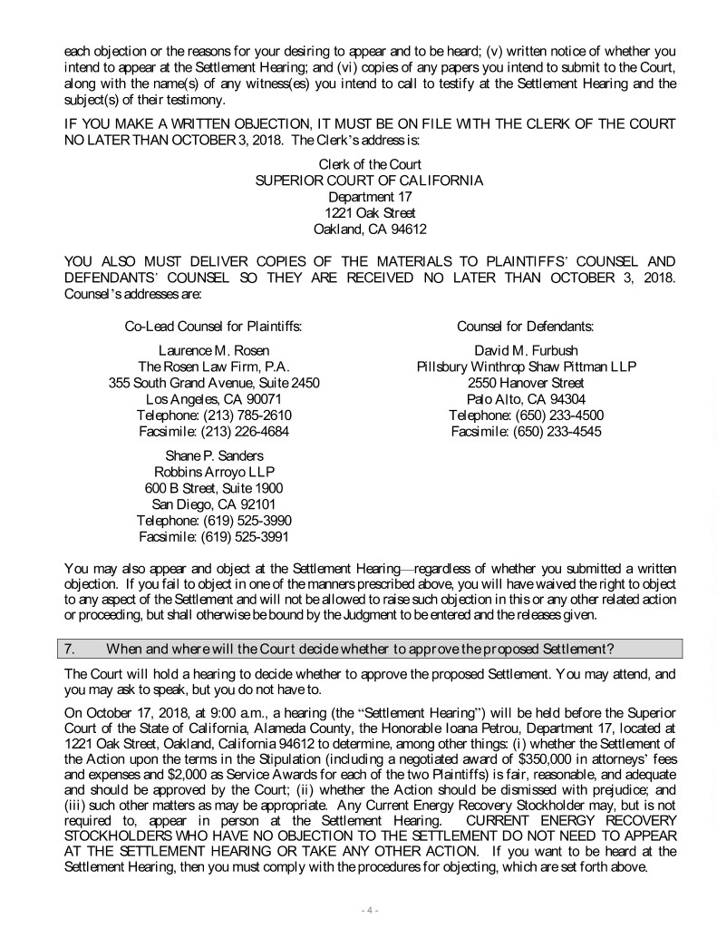 each objection or the reasons for your desiring to appear and to be heard; (v) written notice of whether you intend to appear at the Settlement Hearing; and (vi) copies of any papers you intend to submit to the Court, along with the name(s) of any witness(es) you intend to call to testify at the Settlement Hearing and the subject(s) of their testimony. IF YOU MAKE A WRITTEN OBJECTION, IT MUST BE ON FILE WITH THE CLERK OF THE COURT NO LATER THAN OCTOBER 3, 2018. The Clerk’s address is: Clerk of the Court SUPERIOR COURT OF CALIFORNIA Department 17 1221 Oak Street Oakland, CA 94612 YOU ALSO MUST DELIVER COPIES OF THE MATERIALS TO PLAINTIFFS’ COUNSEL AND DEFENDANTS’ COUNSEL SO THEY ARE RECEIVED NO LATER THAN OCTOBER 3, 2018. Counsel’s addresses are: Co-Lead Counsel for Plaintiffs: Counsel for Defendants: Laurence M. Rosen David M. Furbush The Rosen Law Firm, P.A. Pillsbury Winthrop Shaw Pittman LLP 355 South Grand Avenue, Suite 2450 2550 Hanover Street Los Angeles, CA 90071 Palo Alto, CA 94304 Telephone: (213) 785-2610 Telephone: (650) 233-4500 Facsimile: (213) 226-4684 Facsimile: (650) 233-4545 Shane P. Sanders Robbins Arroyo LLP 600 B Street, Suite 1900 San Diego, CA 92101 Telephone: (619) 525-3990 Facsimile: (619) 525-3991 You may also appear and object at the Settlement Hearing—regardless of whether you submitted a written objection. If you fail to object in one of the manners prescribed above, you will have waived the right to object to any aspect of the Settlement and will not be allowed to raise such objection in this or any other related action or proceeding, but shall otherwise be bound by the Judgment to be entered and the releases given. 7. When and where will the Court decide whether to approve the proposed Settlement? The Court will hold a hearing to decide whether to approve the proposed Settlement. You may attend, and you may ask to speak, but you do not have to. On October 17, 2018, at 9:00 a.m., a hearing (the “Settlement Hearing”) will be held before the Superior Court of the State of California, Alameda County, the Honorable Ioana Petrou, Department 17, located at 1221 Oak Street, Oakland, California 94612 to determine, among other things: (i) whether the Settlement of the Action upon the terms in the Stipulation (including a negotiated award of $350,000 in attorneys’ fees and expenses and $2,000 as Service Awards for each of the two Plaintiffs) is fair, reasonable, and adequate and should be approved by the Court; (ii) whether the Action should be dismissed with prejudice; and (iii) such other matters as may be appropriate. Any Current Energy Recovery Stockholder may, but is not required to, appear in person at the Settlement Hearing. CURRENT ENERGY RECOVERY STOCKHOLDERS WHO HAVE NO OBJECTION TO THE SETTLEMENT DO NOT NEED TO APPEAR AT THE SETTLEMENT HEARING OR TAKE ANY OTHER ACTION. If you want to be heard at the Settlement Hearing, then you must comply with the procedures for objecting, which are set forth above. - 4 -