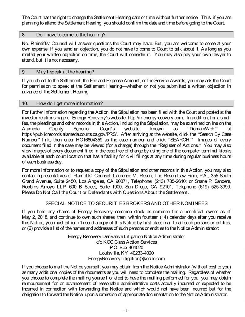 The Court has the right to change the Settlement Hearing date or time without further notice. Thus, if you are planning to attend the Settlement Hearing, you should confirm the date and time before going to the Court. 8. Do I have to come to the hearing? No. Plaintiffs’ Counsel will answer questions the Court may have. But, you are welcome to come at your own expense. If you send an objection, you do not have to come to Court to talk about it. As long as you mailed your written objection on time, the Court will consider it. You may also pay your own lawyer to attend, but it is not necessary. 9. May I speak at the hearing? If you object to the Settlement, the Fee and Expense Amount, or the Service Awards, you may ask the Court for permission to speak at the Settlement Hearing—whether or not you submitted a written objection in advance of the Settlement Hearing. 10. How do I get more information? For further information regarding the Action, the Stipulation has been filed with the Court and posted at the investor relations page of Energy Recovery’s website, http://ir.energyrecovery.com. In addition, for a small fee, the pleadings and other records in this Action, including the Stipulation, may be examined online on the Alameda County Superior Court’s website, known as “DomainWeb,” at https://publicrecords.alameda.courts.ca.gov/PRS/. After arriving at the website, click the “Search By Case Number” link, then enter HG16804359 as the case number and click “SEARCH.” Images of every document filed in the case may be viewed (for a charge) through the “Register of Actions.” You may also view images of every document filed in the case free of charge by using one of the computer terminal kiosks available at each court location that has a facility for civil filings at any time during regular business hours of each business day. For more information or to request a copy of the Stipulation and other records in this Action, you may also contact representatives of Plaintiffs’ Counsel: Laurence M. Rosen, The Rosen Law Firm, P.A., 355 South Grand Avenue, Suite 2450, Los Angeles, CA 90071, Telephone: (213) 785-2610; or Shane P. Sanders, Robbins Arroyo LLP, 600 B Street, Suite 1900, San Diego, CA 92101, Telephone (619) 525-3990. Please Do Not Call the Court or Defendants with Questions About the Settlement. SPECIAL NOTICE TO SECURITIES BROKERS AND OTHER NOMINEES If you held any shares of Energy Recovery common stock as nominee for a beneficial owner as of May 2, 2018, and continue to own such shares, then, within fourteen (14) calendar days after you receive this Notice, you must either: (1) send a copy of this Notice by first-class mail to all such persons or entities; or (2) provide a list of the names and addresses of such persons or entities to the Notice Administrator: Energy Recovery Derivative Litigation Notice Administrator c/o KCC Class Action Services P.O. Box 404020 Louisville, KY 40233-4020 EnergyRecoveryLitigation@kccllc.com If you choose to mail the Notice yourself, you may obtain from the Notice Administrator (without cost to you) as many additional copies of the documents as you will need to complete the mailing. Regardless of whether you choose to complete the mailing yourself or elect to have the mailing performed for you, you may obtain reimbursement for or advancement of reasonable administrative costs actually incurred or expected to be incurred in connection with forwarding the Notice and which would not have been incurred but for the obligation to forward the Notice, upon submission of appropriate documentation to the Notice Administrator. - 5 -