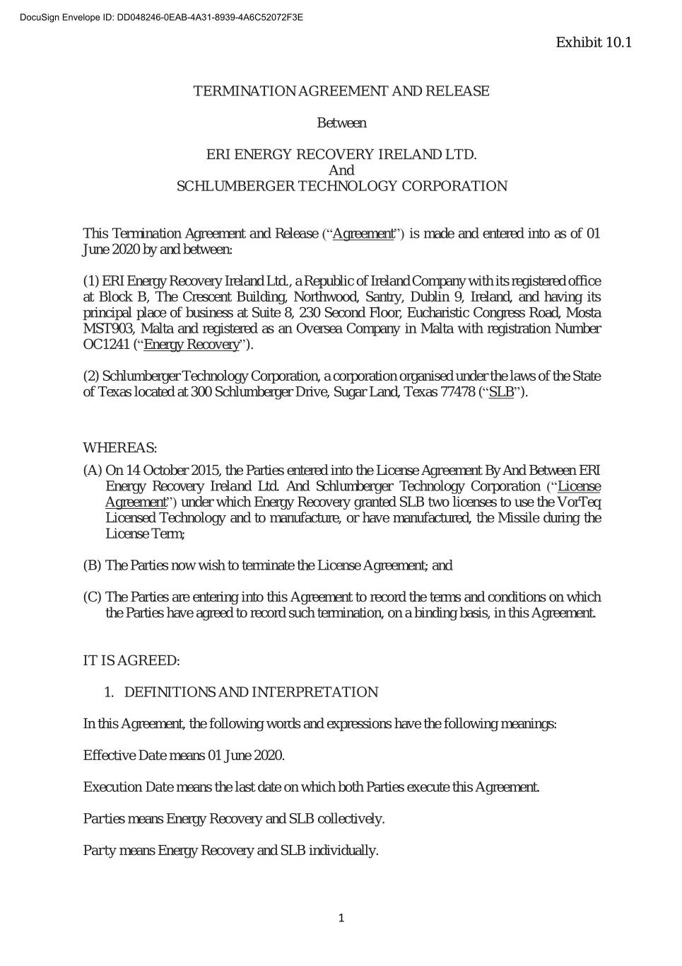 DocuSign Envelope ID: A9F6E60A-8D85-4B48-A0FC-584EEF4833C1DD048246-0EAB-4A31-8939-4A6C52072F3E Exhibit 10.1 TERMINATION AGREEMENT AND RELEASE Between ERI ENERGY RECOVERY IRELAND LTD. And SCHLUMBERGER TECHNOLOGY CORPORATION This Termination Agreement and Release (“Agreement”) is made and entered into as of 01 June 2020 by and between: (1) ERI Energy Recovery Ireland Ltd., a Republic of Ireland Company with its registered office at Block B, The Crescent Building, Northwood, Santry, Dublin 9, Ireland, and having its principal place of business at Suite 8, 230 Second Floor, Eucharistic Congress Road, Mosta MST903, Malta and registered as an Oversea Company in Malta with registration Number OC1241 (“Energy Recovery”). (2) Schlumberger Technology Corporation, a corporation organised under the laws of the State of Texas located at 300 Schlumberger Drive, Sugar Land, Texas 77478 (“SLB”). WHEREAS: (A) On 14 October 2015, the Parties entered into the License Agreement By And Between ERI Energy Recovery Ireland Ltd. And Schlumberger Technology Corporation (“License Agreement”) under which Energy Recovery granted SLB two licenses to use the VorTeq Licensed Technology and to manufacture, or have manufactured, the Missile during the License Term; (B) The Parties now wish to terminate the License Agreement; and (C) The Parties are entering into this Agreement to record the terms and conditions on which the Parties have agreed to record such termination, on a binding basis, in this Agreement. IT IS AGREED: 1. DEFINITIONS AND INTERPRETATION In this Agreement, the following words and expressions have the following meanings: Effective Date means 01 June 2020. Execution Date means the last date on which both Parties execute this Agreement. Parties means Energy Recovery and SLB collectively. Party means Energy Recovery and SLB individually. 1