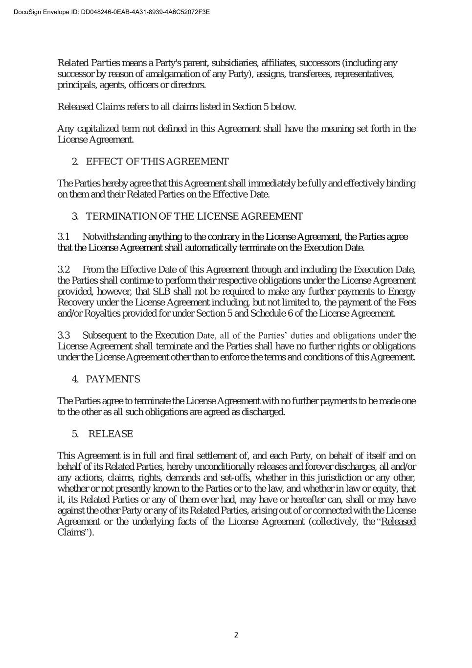 DocuSign Envelope ID: A9F6E60A-8D85-4B48-A0FC-584EEF4833C1DD048246-0EAB-4A31-8939-4A6C52072F3E Related Parties means a Party's parent, subsidiaries, affiliates, successors (including any successor by reason of amalgamation of any Party), assigns, transferees, representatives, principals, agents, officers or directors. Released Claims refers to all claims listed in Section 5 below. Any capitalized term not defined in this Agreement shall have the meaning set forth in the License Agreement. 2. EFFECT OF THIS AGREEMENT The Parties hereby agree that this Agreement shall immediately be fully and effectively binding on them and their Related Parties on the Effective Date. 3. TERMINATION OF THE LICENSE AGREEMENT 3.1 Notwithstanding anything to the contrary in the License Agreement, the Parties agree that the License Agreement shall automatically terminate on the Execution Date. 3.2 From the Effective Date of this Agreement through and including the Execution Date, the Parties shall continue to perform their respective obligations under the License Agreement provided, however, that SLB shall not be required to make any further payments to Energy Recovery under the License Agreement including, but not limited to, the payment of the Fees and/or Royalties provided for under Section 5 and Schedule 6 of the License Agreement. 3.3 Subsequent to the Execution Date, all of the Parties’ duties and obligations under the License Agreement shall terminate and the Parties shall have no further rights or obligations under the License Agreement other than to enforce the terms and conditions of this Agreement. 4. PAYMENTS The Parties agree to terminate the License Agreement with no further payments to be made one to the other as all such obligations are agreed as discharged. 5. RELEASE This Agreement is in full and final settlement of, and each Party, on behalf of itself and on behalf of its Related Parties, hereby unconditionally releases and forever discharges, all and/or any actions, claims, rights, demands and set-offs, whether in this jurisdiction or any other, whether or not presently known to the Parties or to the law, and whether in law or equity, that it, its Related Parties or any of them ever had, may have or hereafter can, shall or may have against the other Party or any of its Related Parties, arising out of or connected with the License Agreement or the underlying facts of the License Agreement (collectively, the “Released Claims”). 2
