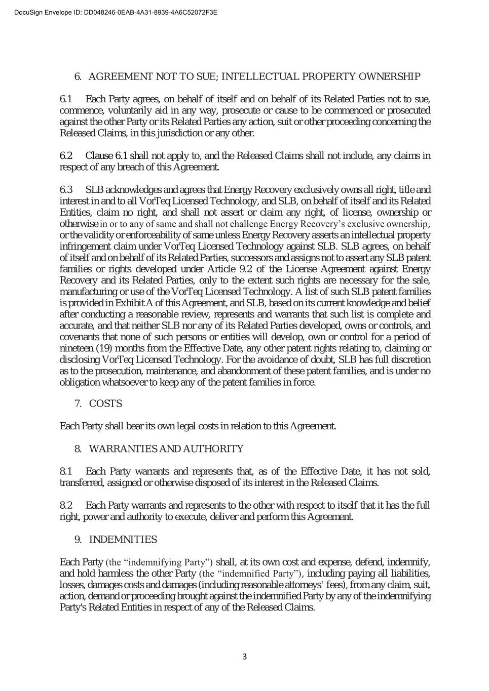 DocuSign Envelope ID: A9F6E60A-8D85-4B48-A0FC-584EEF4833C1DD048246-0EAB-4A31-8939-4A6C52072F3E 6. AGREEMENT NOT TO SUE; INTELLECTUAL PROPERTY OWNERSHIP 6.1 Each Party agrees, on behalf of itself and on behalf of its Related Parties not to sue, commence, voluntarily aid in any way, prosecute or cause to be commenced or prosecuted against the other Party or its Related Parties any action, suit or other proceeding concerning the Released Claims, in this jurisdiction or any other. 6.2 Clause 6.1 shall not apply to, and the Released Claims shall not include, any claims in respect of any breach of this Agreement. 6.3 SLB acknowledges and agrees that Energy Recovery exclusively owns all right, title and interest in and to all VorTeq Licensed Technology, and SLB, on behalf of itself and its Related Entities, claim no right, and shall not assert or claim any right, of license, ownership or otherwise in or to any of same and shall not challenge Energy Recovery’s exclusive ownership, or the validity or enforceability of same unless Energy Recovery asserts an intellectual property infringement claim under VorTeq Licensed Technology against SLB. SLB agrees, on behalf of itself and on behalf of its Related Parties, successors and assigns not to assert any SLB patent families or rights developed under Article 9.2 of the License Agreement against Energy Recovery and its Related Parties, only to the extent such rights are necessary for the sale, manufacturing or use of the VorTeq Licensed Technology. A list of such SLB patent families is provided in Exhibit A of this Agreement, and SLB, based on its current knowledge and belief after conducting a reasonable review, represents and warrants that such list is complete and accurate, and that neither SLB nor any of its Related Parties developed, owns or controls, and covenants that none of such persons or entities will develop, own or control for a period of nineteen (19) months from the Effective Date, any other patent rights relating to, claiming or disclosing VorTeq Licensed Technology. For the avoidance of doubt, SLB has full discretion as to the prosecution, maintenance, and abandonment of these patent families, and is under no obligation whatsoever to keep any of the patent families in force. 7. COSTS Each Party shall bear its own legal costs in relation to this Agreement. 8. WARRANTIES AND AUTHORITY 8.1 Each Party warrants and represents that, as of the Effective Date, it has not sold, transferred, assigned or otherwise disposed of its interest in the Released Claims. 8.2 Each Party warrants and represents to the other with respect to itself that it has the full right, power and authority to execute, deliver and perform this Agreement. 9. INDEMNITIES Each Party (the “indemnifying Party”) shall, at its own cost and expense, defend, indemnify, and hold harmless the other Party (the “indemnified Party”), including paying all liabilities, losses, damages costs and damages (including reasonable attorneys’ fees), from any claim, suit, action, demand or proceeding brought against the indemnified Party by any of the indemnifying Party's Related Entities in respect of any of the Released Claims. 3