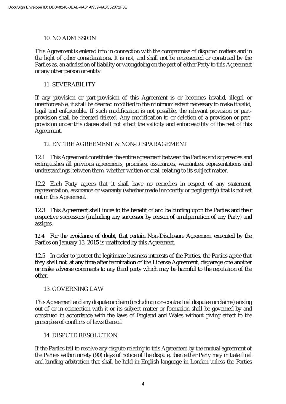 DocuSign Envelope ID: A9F6E60A-8D85-4B48-A0FC-584EEF4833C1DD048246-0EAB-4A31-8939-4A6C52072F3E 10. NO ADMISSION This Agreement is entered into in connection with the compromise of disputed matters and in the light of other considerations. It is not, and shall not be represented or construed by the Parties as, an admission of liability or wrongdoing on the part of either Party to this Agreement or any other person or entity. 11. SEVERABILITY If any provision or part-provision of this Agreement is or becomes invalid, illegal or unenforceable, it shall be deemed modified to the minimum extent necessary to make it valid, legal and enforceable. If such modification is not possible, the relevant provision or part- provision shall be deemed deleted. Any modification to or deletion of a provision or part- provision under this clause shall not affect the validity and enforceability of the rest of this Agreement. 12. ENTIRE AGREEMENT & NON-DISPARAGEMENT 12.1 This Agreement constitutes the entire agreement between the Parties and supersedes and extinguishes all previous agreements, promises, assurances, warranties, representations and understandings between them, whether written or oral, relating to its subject matter. 12.2 Each Party agrees that it shall have no remedies in respect of any statement, representation, assurance or warranty (whether made innocently or negligently) that is not set out in this Agreement. 12.3 This Agreement shall inure to the benefit of and be binding upon the Parties and their respective successors (including any successor by reason of amalgamation of any Party) and assigns. 12.4 For the avoidance of doubt, that certain Non-Disclosure Agreement executed by the Parties on January 13, 2015 is unaffected by this Agreement. 12.5 In order to protect the legitimate business interests of the Parties, the Parties agree that they shall not, at any time after termination of the License Agreement, disparage one another or make adverse comments to any third party which may be harmful to the reputation of the other. 13. GOVERNING LAW This Agreement and any dispute or claim (including non-contractual disputes or claims) arising out of or in connection with it or its subject matter or formation shall be governed by and construed in accordance with the laws of England and Wales without giving effect to the principles of conflicts of laws thereof. 14. DISPUTE RESOLUTION If the Parties fail to resolve any dispute relating to this Agreement by the mutual agreement of the Parties within ninety (90) days of notice of the dispute, then either Party may initiate final and binding arbitration that shall be held in English language in London unless the Parties 4