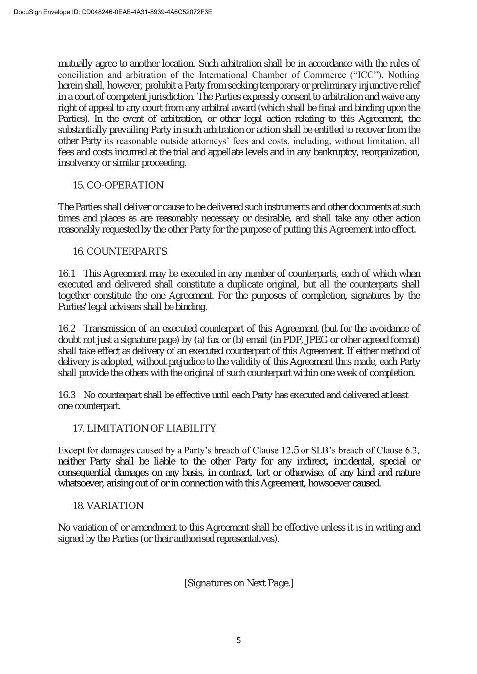 DocuSign Envelope ID: A9F6E60A-8D85-4B48-A0FC-584EEF4833C1DD048246-0EAB-4A31-8939-4A6C52072F3E mutually agree to another location. Such arbitration shall be in accordance with the rules of conciliation and arbitration of the International Chamber of Commerce (“ICC”). Nothing herein shall, however, prohibit a Party from seeking temporary or preliminary injunctive relief in a court of competent jurisdiction. The Parties expressly consent to arbitration and waive any right of appeal to any court from any arbitral award (which shall be final and binding upon the Parties). In the event of arbitration, or other legal action relating to this Agreement, the substantially prevailing Party in such arbitration or action shall be entitled to recover from the other Party its reasonable outside attorneys’ fees and costs, including, without limitation, all fees and costs incurred at the trial and appellate levels and in any bankruptcy, reorganization, insolvency or similar proceeding. 15. CO-OPERATION The Parties shall deliver or cause to be delivered such instruments and other documents at such times and places as are reasonably necessary or desirable, and shall take any other action reasonably requested by the other Party for the purpose of putting this Agreement into effect. 16. COUNTERPARTS 16.1 This Agreement may be executed in any number of counterparts, each of which when executed and delivered shall constitute a duplicate original, but all the counterparts shall together constitute the one Agreement. For the purposes of completion, signatures by the Parties' legal advisers shall be binding. 16.2 Transmission of an executed counterpart of this Agreement (but for the avoidance of doubt not just a signature page) by (a) fax or (b) email (in PDF, JPEG or other agreed format) shall take effect as delivery of an executed counterpart of this Agreement. If either method of delivery is adopted, without prejudice to the validity of this Agreement thus made, each Party shall provide the others with the original of such counterpart within one week of completion. 16.3 No counterpart shall be effective until each Party has executed and delivered at least one counterpart. 17. LIMITATION OF LIABILITY Except for damages caused by a Party’s breach of Clause 12.5 or SLB’s breach of Clause 6.3, neither Party shall be liable to the other Party for any indirect, incidental, special or consequential damages on any basis, in contract, tort or otherwise, of any kind and nature whatsoever, arising out of or in connection with this Agreement, howsoever caused. 18. VARIATION No variation of or amendment to this Agreement shall be effective unless it is in writing and signed by the Parties (or their authorised representatives). [Signatures on Next Page.] 5