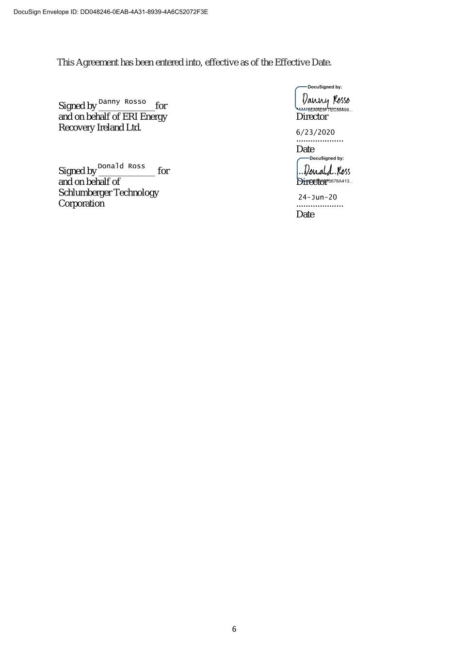 DocuSign Envelope ID: A9F6E60A-8D85-4B48-A0FC-584EEF4833C1DD048246-0EAB-4A31-8939-4A6C52072F3E This Agreement has been entered into, effective as of the Effective Date. Signed by ____________forDanny Rosso .................... and on behalf of ERI Energy Director Recovery Ireland Ltd. 6/23/2020 .................... Date Donald Ross Signed by ____________ for .................... and on behalf of Director Schlumberger Technology 24-Jun-20 Corporation .................... Date 6