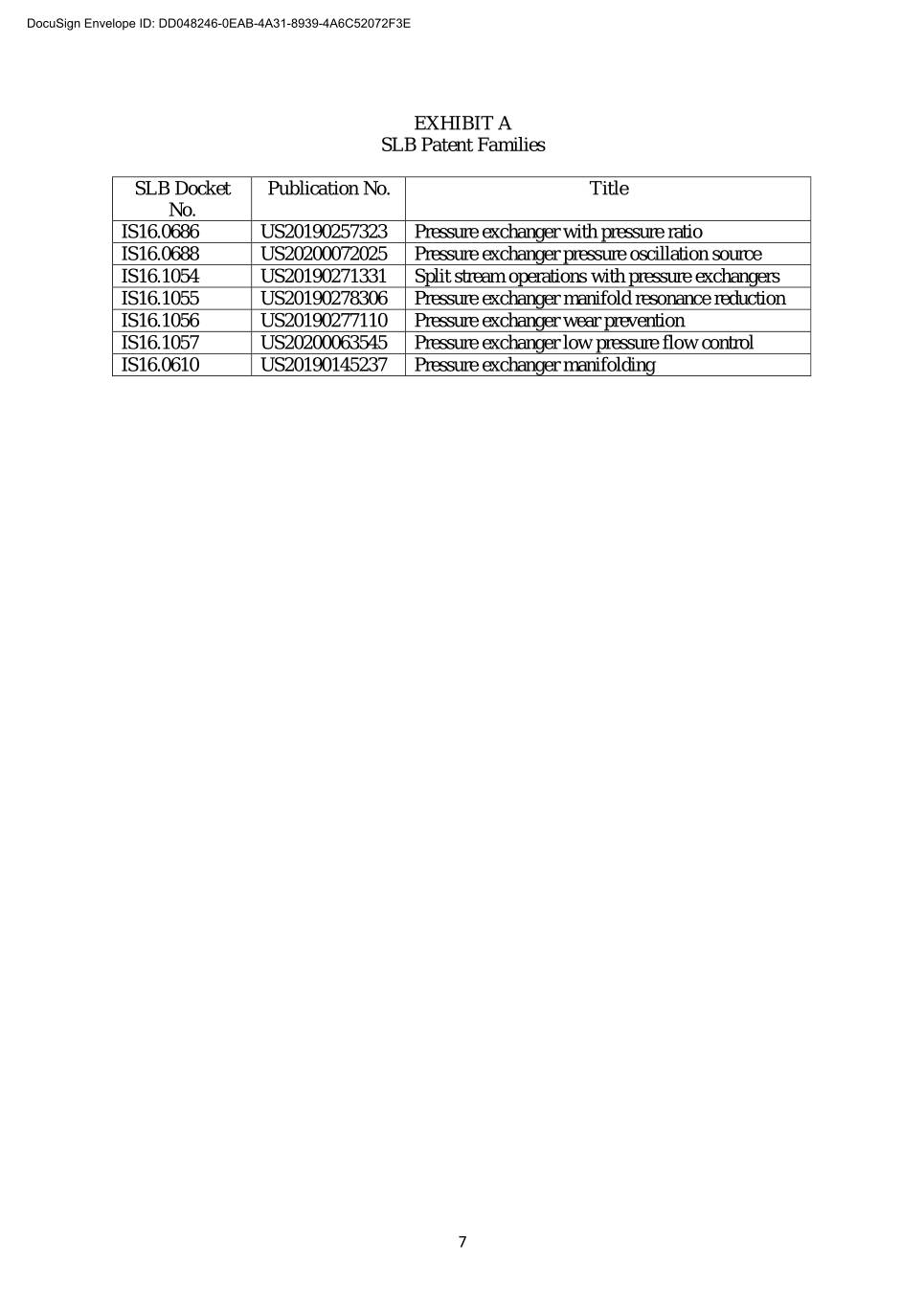 DocuSign Envelope ID: A9F6E60A-8D85-4B48-A0FC-584EEF4833C1DD048246-0EAB-4A31-8939-4A6C52072F3E EXHIBIT A SLB Patent Families SLB Docket Publication No. Title No. IS16.0686 US20190257323 Pressure exchanger with pressure ratio IS16.0688 US20200072025 Pressure exchanger pressure oscillation source IS16.1054 US20190271331 Split stream operations with pressure exchangers IS16.1055 US20190278306 Pressure exchanger manifold resonance reduction IS16.1056 US20190277110 Pressure exchanger wear prevention IS16.1057 US20200063545 Pressure exchanger low pressure flow control IS16.0610 US20190145237 Pressure exchanger manifolding 7