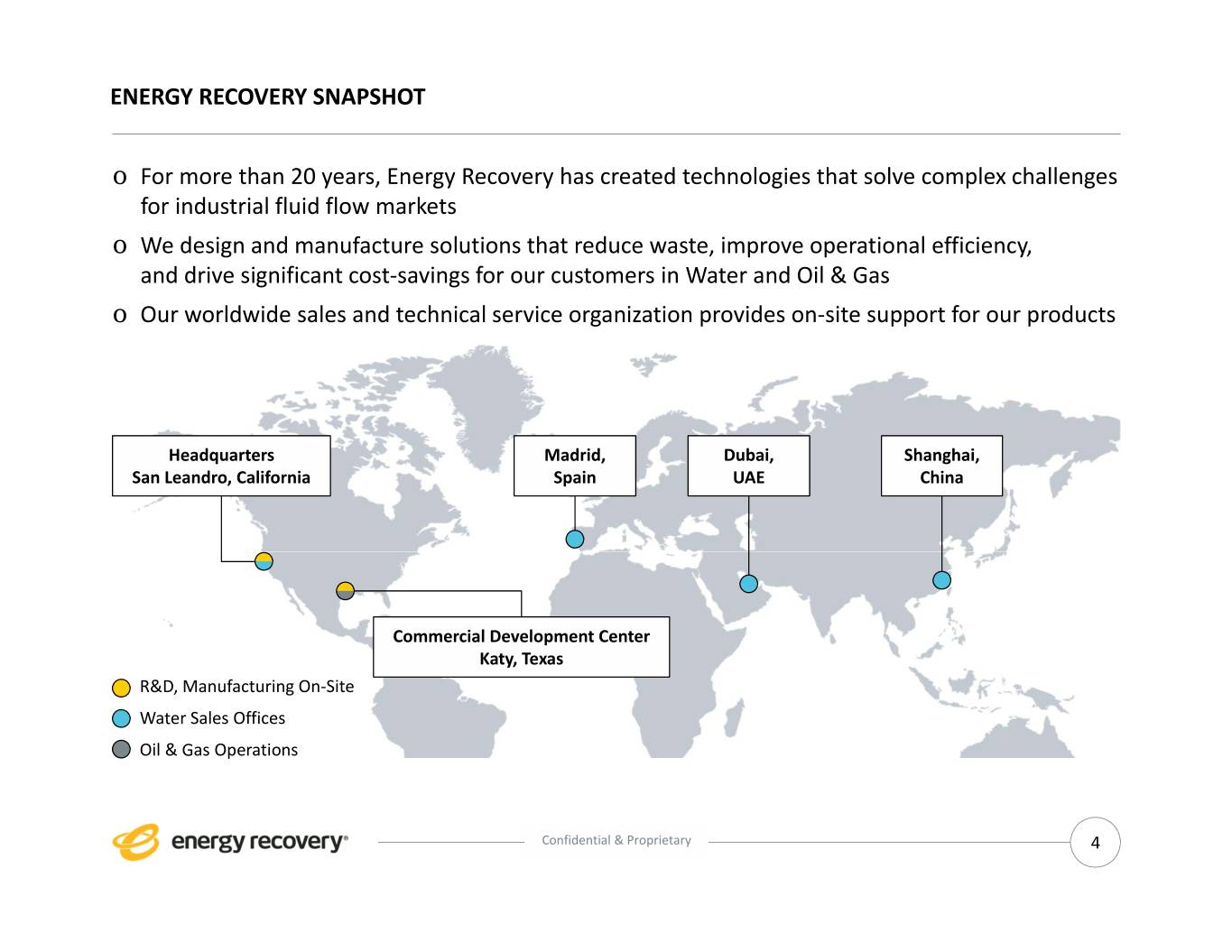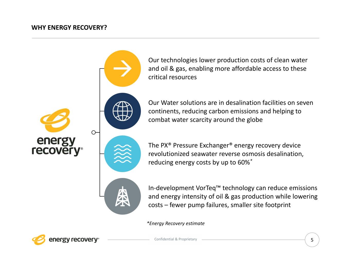 ENERGY RECOVERY SNAPSHOT o For more than 20 years, Energy Recovery has created technologies that solve complex challenges for industrial fluid flow markets o We design and manufacture solutions that reduce waste, improve operational efficiency, and drive significant cost‐savings for our customers in Water and Oil & Gas o Our worldwide sales and technical service organization provides on‐site support for our products Headquarters Madrid, Dubai, Shanghai, San Leandro, California Spain UAE China Commercial Development Center Katy, Texas R&D, Manufacturing On‐Site Water Sales Offices Oil & Gas Operations Confidential & Proprietary 4