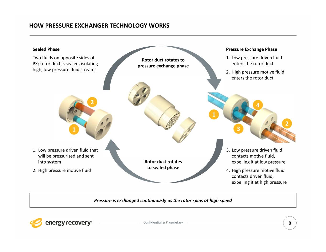 OUR CORE TECHNOLOGY PLATFORM IS THE PRESSURE EXCHANGER (PX) o Our pressure exchanger acts like a fluid piston, transferring energy between high‐ and low‐ pressure fluids through continuously rotating ducts o PX technology provides benefits in a variety of industrial applications using high‐pressure fluids . Water – pressure exchangers lower energy consumption and emissions, as well as reduce the pump size needed for seawater reverse osmosis desalination (PX Pressure Exchanger) . Oil & Gas – pressure exchangers can protect pumps from erosion, reducing equipment failure common during well completion and drilling operations (VorTeq) Pressure Exchanger Internal Components Fluid Flows in a Pressure Exchanger Transfers energy with only one Housing moving part (rotor) End Cover Sleeve Rotor and Duct Cartridge Confidential & Proprietary 7