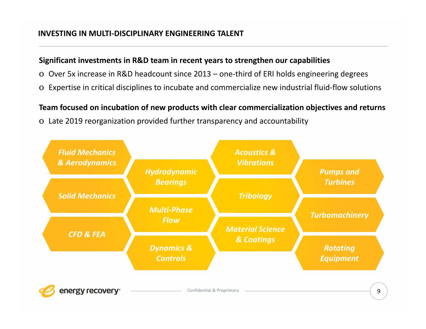 INVESTING IN MULTI‐DISCIPLINARY ENGINEERING TALENT Significant investments in R&D team in recent years to strengthen our capabilities o Over 5x increase in R&D headcount since 2013 – one‐third of ERI holds engineering degrees o Expertise in critical disciplines to incubate and commercialize new industrial fluid‐flow solutions Team focused on incubation of new products with clear commercialization objectives and returns o Late 2019 reorganization provided further transparency and accountability Fluid Mechanics Acoustics & & Aerodynamics Vibrations Hydrodynamic Pumps and Bearings Turbines Solid Mechanics Tribology Multi‐Phase Turbomachinery Flow Material Science CFD & FEA & Coatings Dynamics & Rotating Controls Equipment Confidential & Proprietary 9