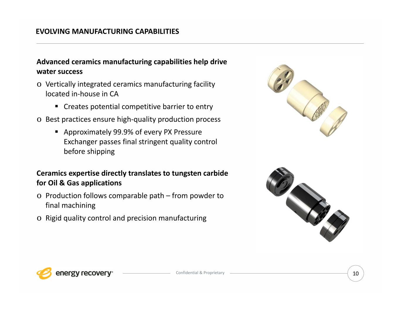 EVOLVING MANUFACTURING CAPABILITIES Advanced ceramics manufacturing capabilities help drive water success o Vertically integrated ceramics manufacturing facility located in‐house in CA . Creates potential competitive barrier to entry o Best practices ensure high‐quality production process . Approximately 99.9% of every PX Pressure Exchanger passes final stringent quality control before shipping Ceramics expertise directly translates to tungsten carbide for Oil & Gas applications o Production follows comparable path – from powder to final machining o Rigid quality control and precision manufacturing Confidential & Proprietary 10