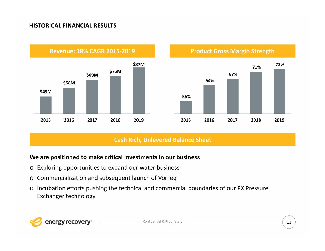 HISTORICAL FINANCIAL RESULTS Revenue: 18% CAGR 2015‐2019 Product Gross Margin Strength $87M 72% 71% $75M $69M 67% $58M 64% $45M 56% 2015 2016 2017 2018 2019 2015 2016 2017 2018 2019 Cash Rich, Unlevered Balance Sheet We are positioned to make critical investments in our business o Exploring opportunities to expand our water business o Commercialization and subsequent launch of VorTeq o Incubation efforts pushing the technical and commercial boundaries of our PX Pressure Exchanger technology Confidential & Proprietary 11