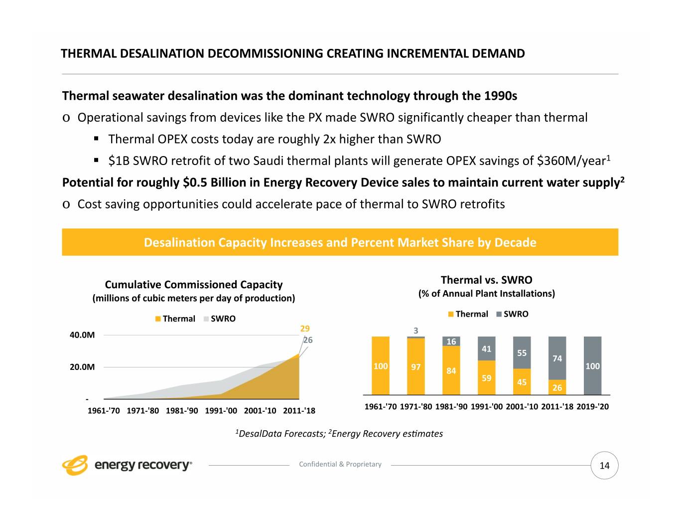 THERMAL DESALINATION DECOMMISSIONING CREATING INCREMENTAL DEMAND Thermal seawater desalination was the dominant technology through the 1990s o Operational savings from devices like the PX made SWRO significantly cheaper than thermal . Thermal OPEX costs today are roughly 2x higher than SWRO . $1B SWRO retrofit of two Saudi thermal plants will generate OPEX savings of $360M/year1 Potential for roughly $0.5 Billion in Energy Recovery Device sales to maintain current water supply2 o Cost saving opportunities could accelerate pace of thermal to SWRO retrofits Desalination Capacity Increases and Percent Market Share by Decade Cumulative Commissioned Capacity Thermal vs. SWRO (millions of cubic meters per day of production) (% of Annual Plant Installations) Thermal SWRO Thermal SWRO 29 40.0M 3 26 16 41 55 74 20.0M 100 97 84 100 59 45 26 ‐ 1961‐'70 1971‐'80 1981‐'90 1991‐'00 2001‐'10 2011‐'18 1961‐'70 1971‐'80 1981‐'90 1991‐'00 2001‐'10 2011‐'18 2019‐'20 1DesalData Forecasts; 2Energy Recovery esmates Confidential & Proprietary 14