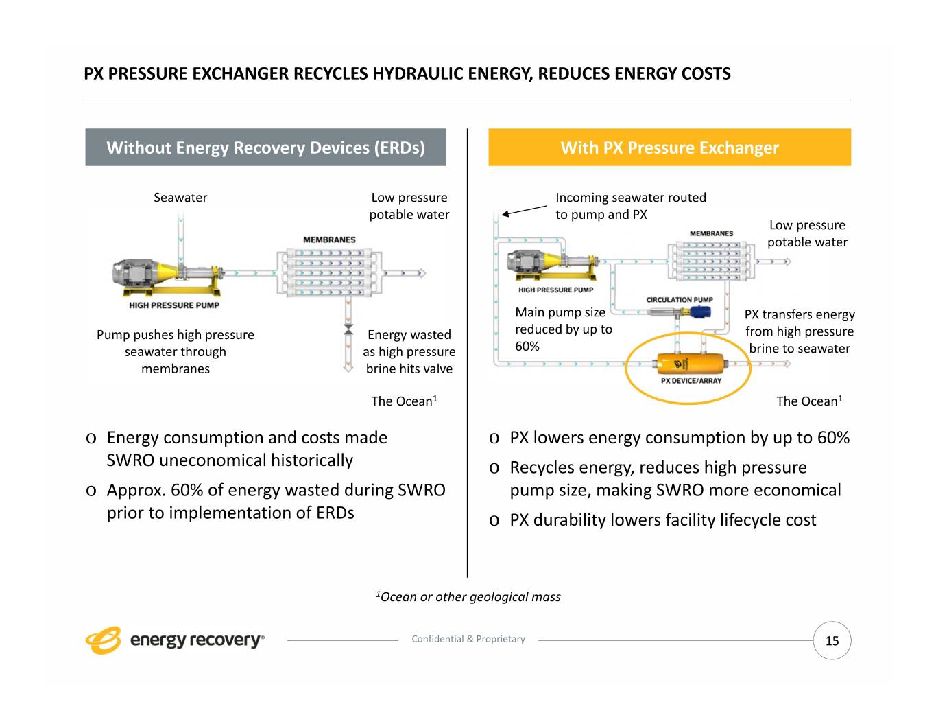 PX PRESSURE EXCHANGER RECYCLES HYDRAULIC ENERGY, REDUCES ENERGY COSTS Without Energy Recovery Devices (ERDs) With PX Pressure Exchanger Seawater Low pressure Incoming seawater routed potable water to pump and PX Low pressure potable water Main pump size PX transfers energy Pump pushes high pressure Energy wasted reduced by up to from high pressure seawater through as high pressure 60% brine to seawater membranes brine hits valve The Ocean1 The Ocean1 o Energy consumption and costs made o PX lowers energy consumption by up to 60% SWRO uneconomical historically o Recycles energy, reduces high pressure o Approx. 60% of energy wasted during SWRO pump size, making SWRO more economical prior to implementation of ERDs o PX durability lowers facility lifecycle cost 1Ocean or other geological mass Confidential & Proprietary 15