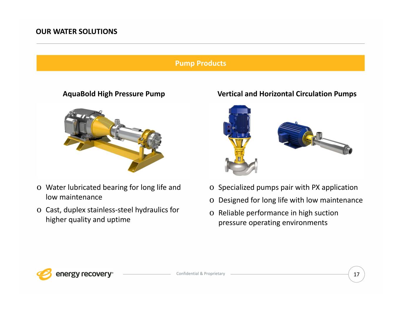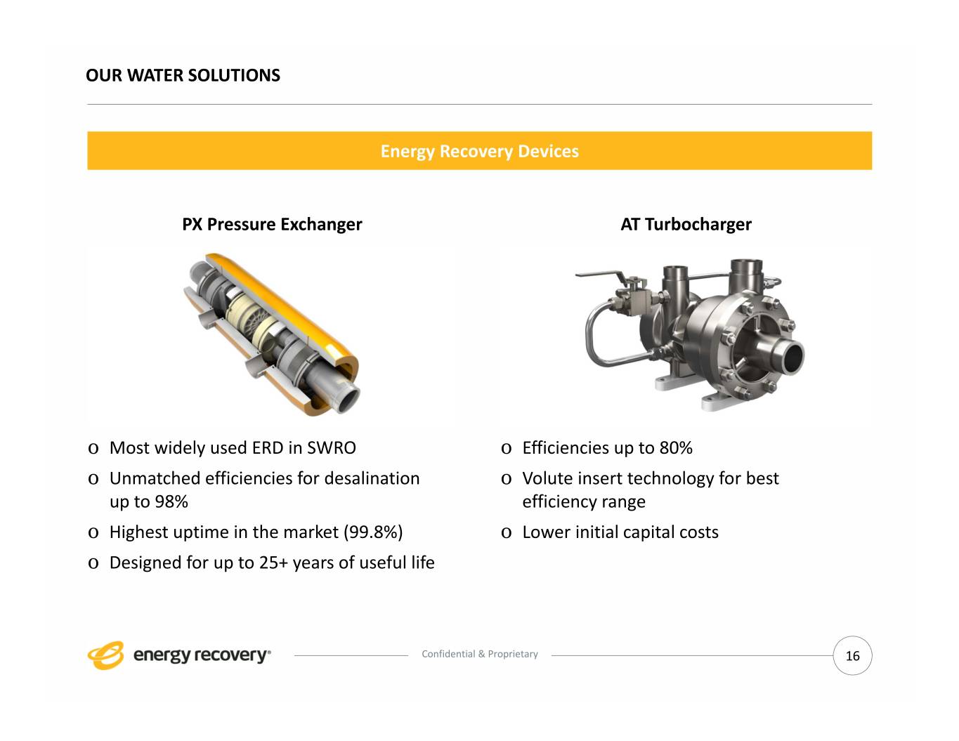 OUR WATER SOLUTIONS Energy Recovery Devices PX Pressure Exchanger AT Turbocharger o Most widely used ERD in SWRO o Efficiencies up to 80% o Unmatched efficiencies for desalination o Volute insert technology for best up to 98% efficiency range o Highest uptime in the market (99.8%) o Lower initial capital costs o Designed for up to 25+ years of useful life Confidential & Proprietary 16