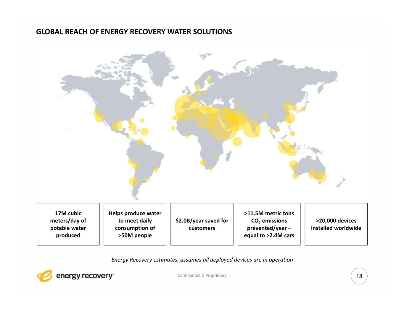 GLOBAL REACH OF ENERGY RECOVERY WATER SOLUTIONS 17M cubic Helps produce water >11.5M metric tons meters/day of to meet daily $2.0B/year saved for CO2 emissions >20,000 devices potable water consumption of customers prevented/year – installed worldwide produced >50M people equal to >2.4M cars Energy Recovery estimates, assumes all deployed devices are in operation Confidential & Proprietary 18