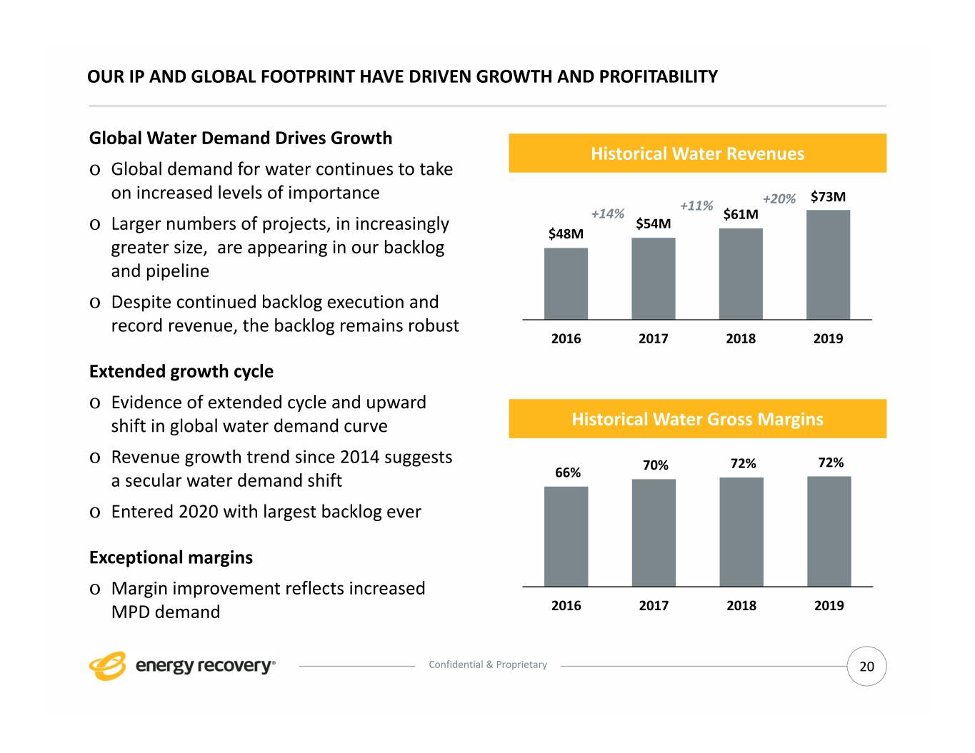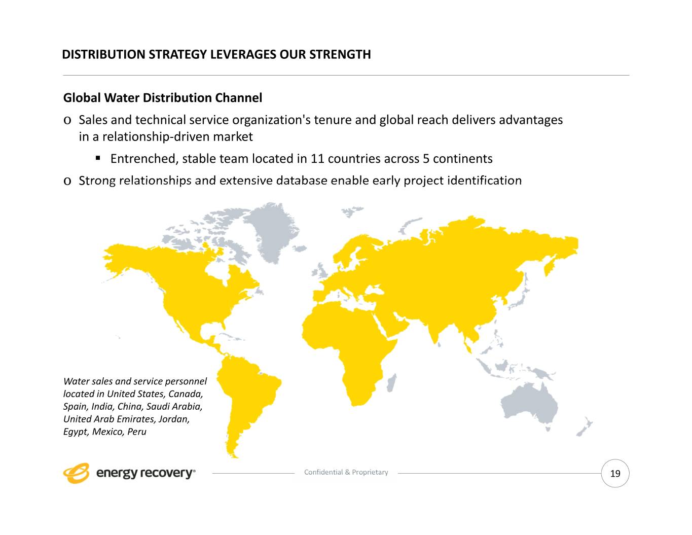 DISTRIBUTION STRATEGY LEVERAGES OUR STRENGTH Global Water Distribution Channel o Sales and technical service organization's tenure and global reach delivers advantages in a relationship‐driven market . Entrenched, stable team located in 11 countries across 5 continents o Strong relationships and extensive database enable early project identification Water sales and service personnel located in United States, Canada, Spain, India, China, Saudi Arabia, United Arab Emirates, Jordan, Egypt, Mexico, Peru Confidential & Proprietary 19