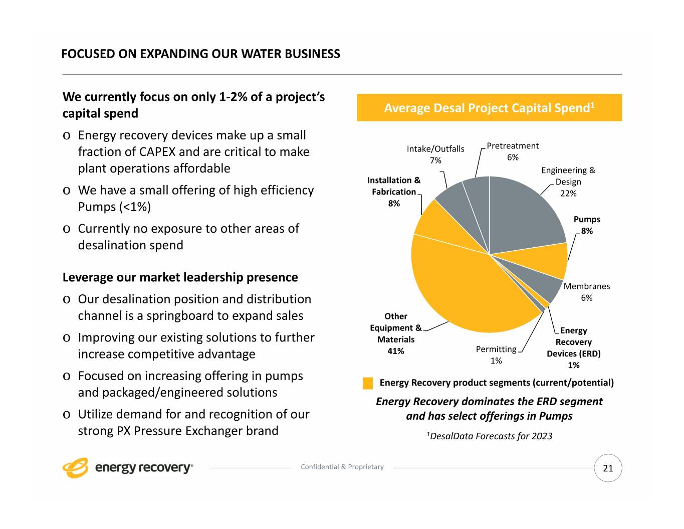 FOCUSED ON EXPANDING OUR WATER BUSINESS We currently focus on only 1‐2% of a project’s 1 capital spend Average Desal Project Capital Spend o Energy recovery devices make up a small fraction of CAPEX and are critical to make Intake/Outfalls Pretreatment 7% 6% plant operations affordable Engineering & Installation & Design o We have a small offering of high efficiency Fabrication 22% Pumps (<1%) 8% Pumps o Currently no exposure to other areas of 8% desalination spend Leverage our market leadership presence Membranes o Our desalination position and distribution 6% channel is a springboard to expand sales Other Equipment & Energy o Improving our existing solutions to further Materials Recovery increase competitive advantage 41% Permitting Devices (ERD) 1% 1% o Focused on increasing offering in pumps Energy Recovery product segments (current/potential) and packaged/engineered solutions Energy Recovery dominates the ERD segment o Utilize demand for and recognition of our and has select offerings in Pumps strong PX Pressure Exchanger brand 1DesalData Forecasts for 2023 Confidential & Proprietary 21