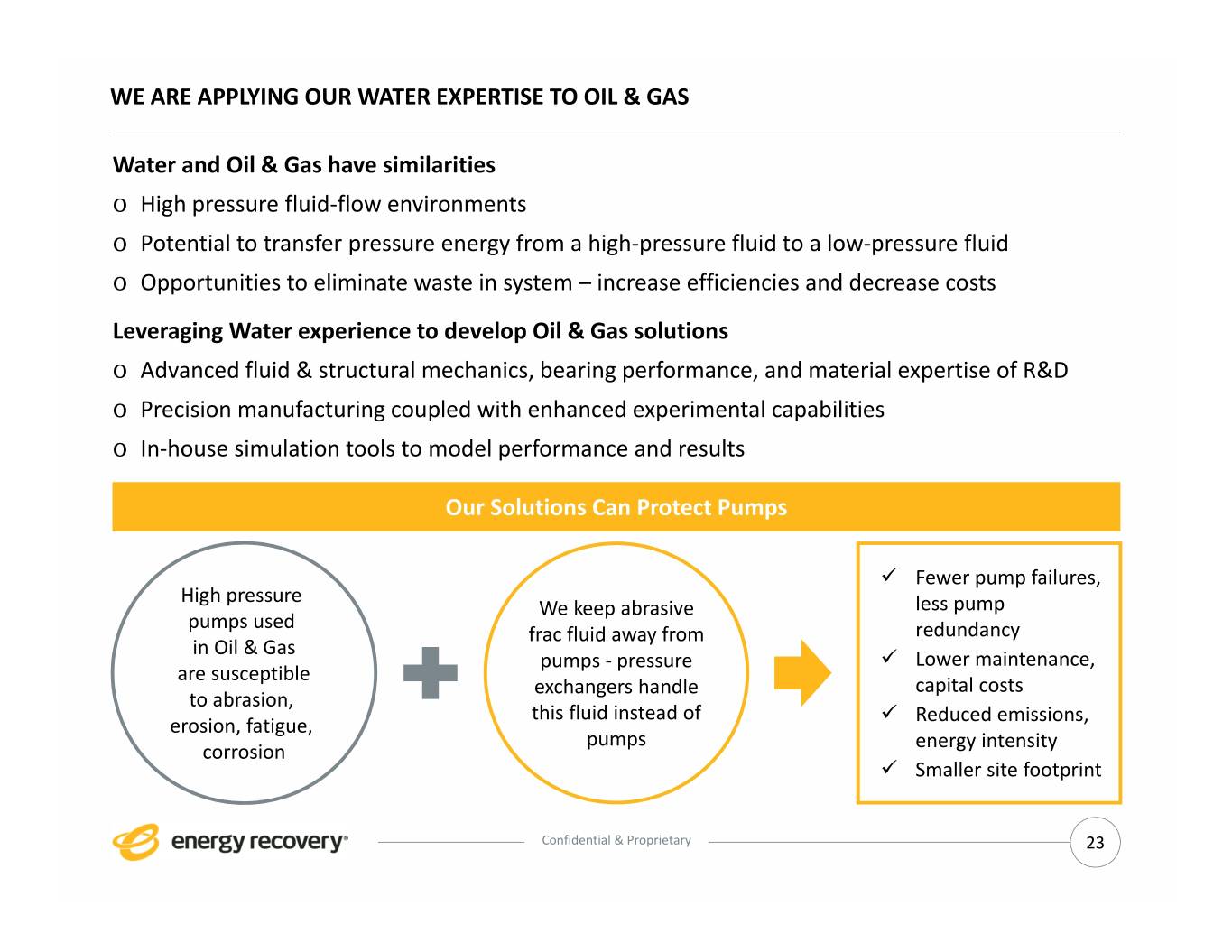 WE ARE APPLYING OUR WATER EXPERTISE TO OIL & GAS Water and Oil & Gas have similarities o High pressure fluid‐flow environments o Potential to transfer pressure energy from a high‐pressure fluid to a low‐pressure fluid o Opportunities to eliminate waste in system – increase efficiencies and decrease costs Leveraging Water experience to develop Oil & Gas solutions o Advanced fluid & structural mechanics, bearing performance, and material expertise of R&D o Precision manufacturing coupled with enhanced experimental capabilities o In‐house simulation tools to model performance and results Our Solutions Can Protect Pumps Fewer pump failures, High pressure We keep abrasive less pump pumps used frac fluid away from redundancy in Oil & Gas pumps ‐ pressure Lower maintenance, are susceptible exchangers handle capital costs to abrasion, this fluid instead of Reduced emissions, erosion, fatigue, pumps energy intensity corrosion Smaller site footprint Confidential & Proprietary 23