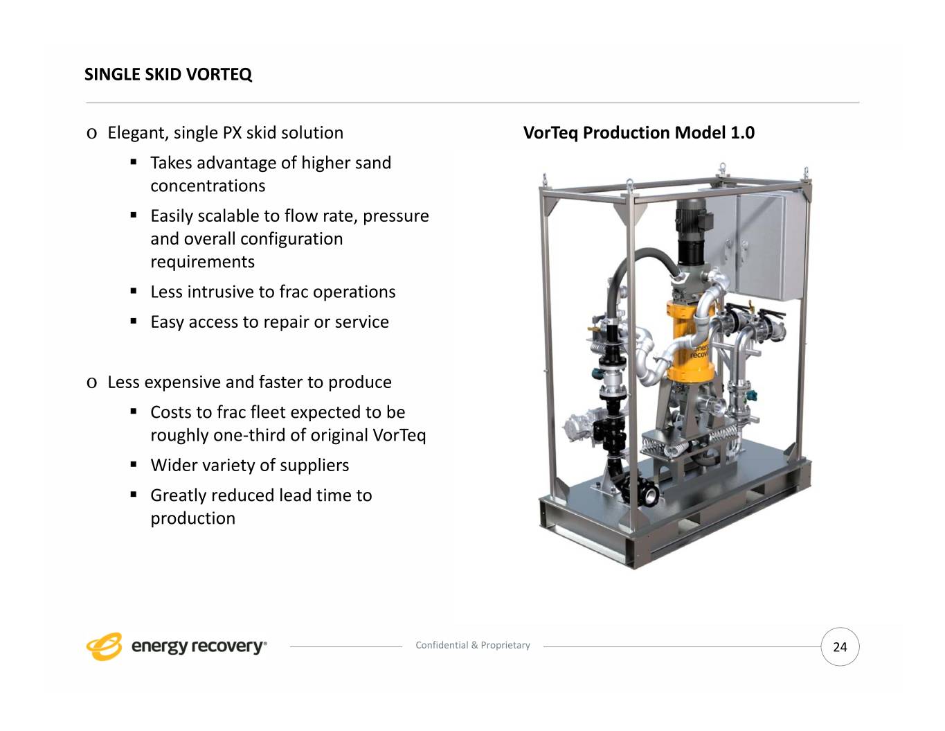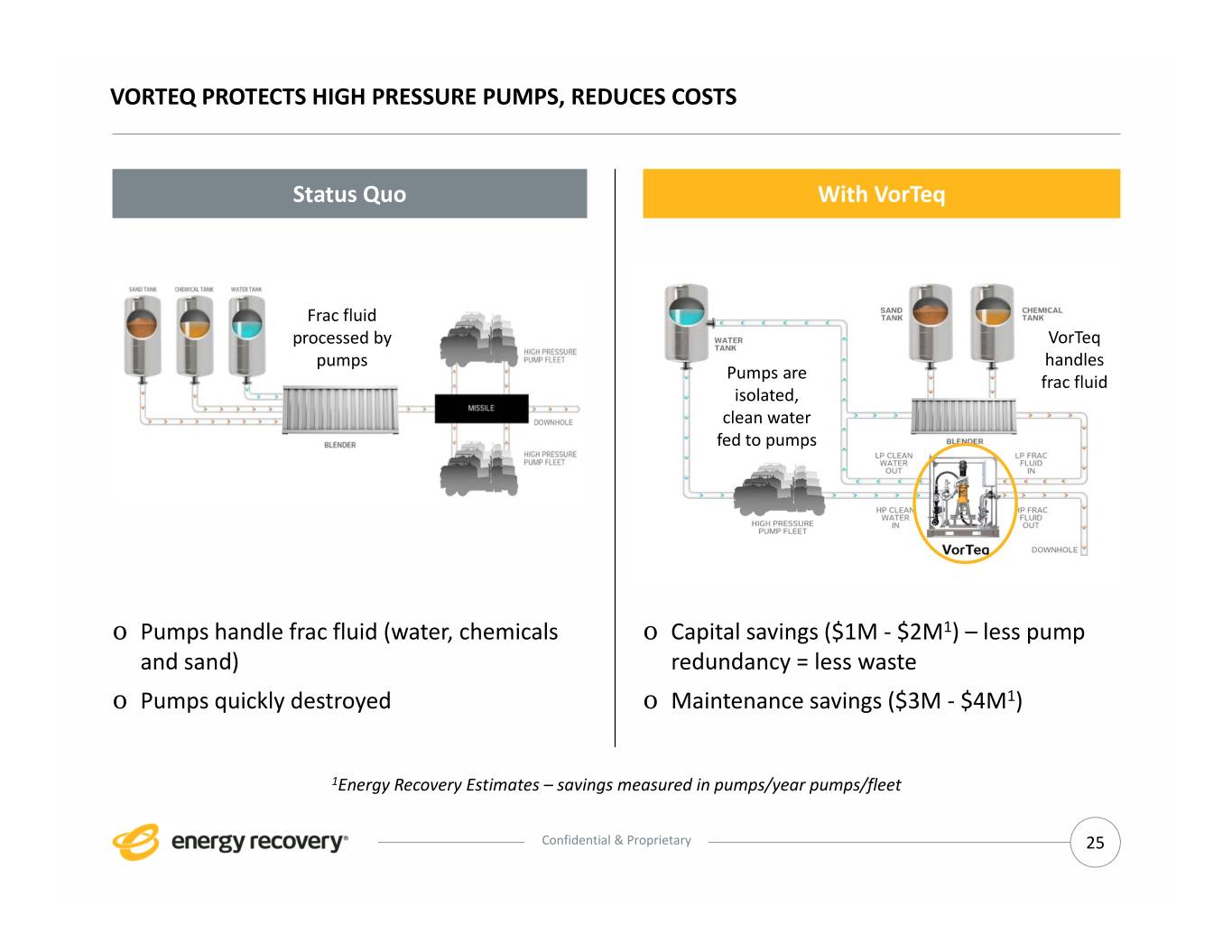 SINGLE SKID VORTEQ o Elegant, single PX skid solution VorTeq Production Model 1.0 . Takes advantage of higher sand concentrations . Easily scalable to flow rate, pressure and overall configuration requirements . Less intrusive to frac operations . Easy access to repair or service o Less expensive and faster to produce . Costs to frac fleet expected to be roughly one‐third of original VorTeq . Wider variety of suppliers . Greatly reduced lead time to production Confidential & Proprietary 24
