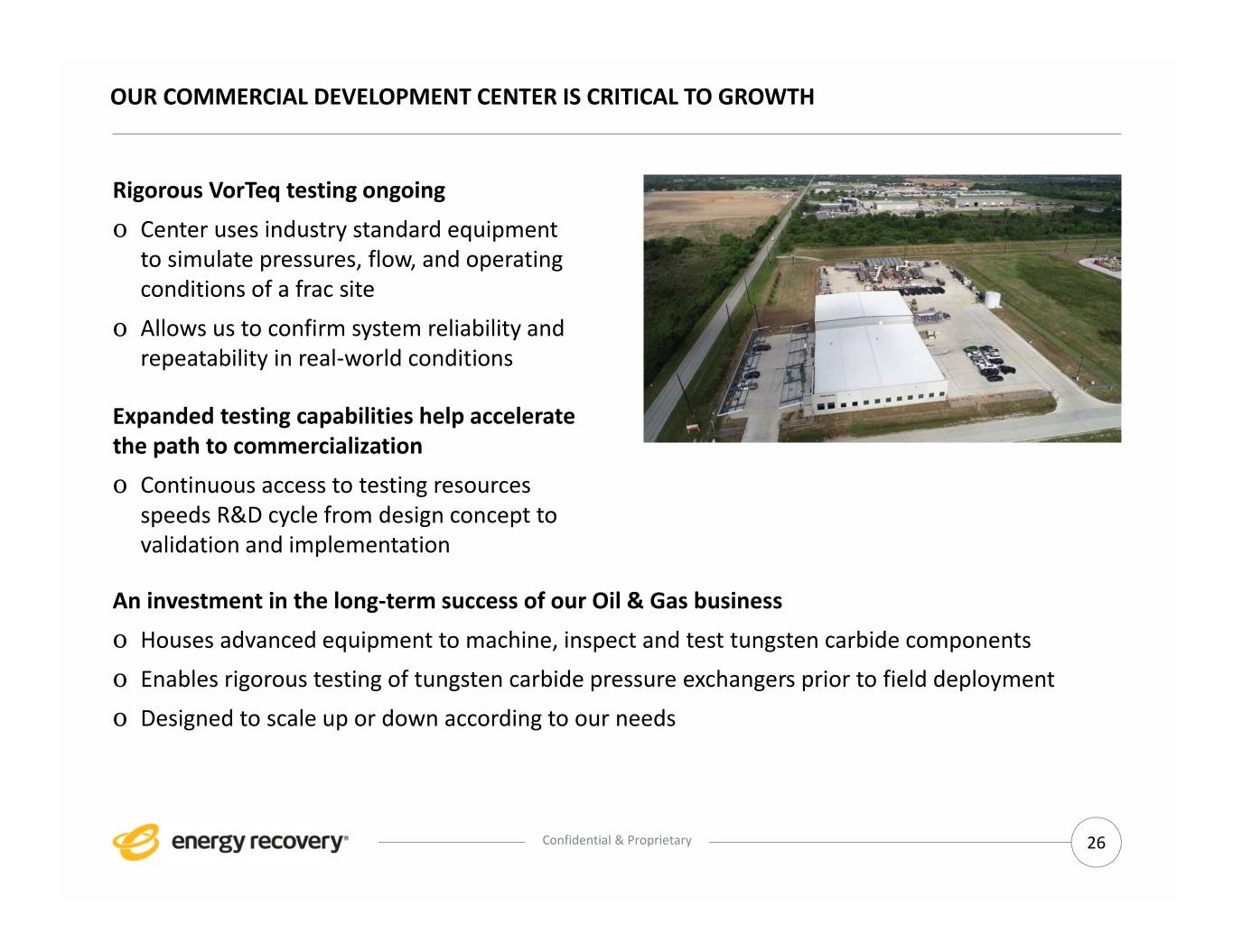 OUR COMMERCIAL DEVELOPMENT CENTER IS CRITICAL TO GROWTH Rigorous VorTeq testing ongoing o Center uses industry standard equipment to simulate pressures, flow, and operating conditions of a frac site o Allows us to confirm system reliability and repeatability in real‐world conditions Expanded testing capabilities help accelerate the path to commercialization o Continuous access to testing resources speeds R&D cycle from design concept to validation and implementation An investment in the long‐term success of our Oil & Gas business o Houses advanced equipment to machine, inspect and test tungsten carbide components o Enables rigorous testing of tungsten carbide pressure exchangers prior to field deployment o Designed to scale up or down according to our needs Confidential & Proprietary 26
