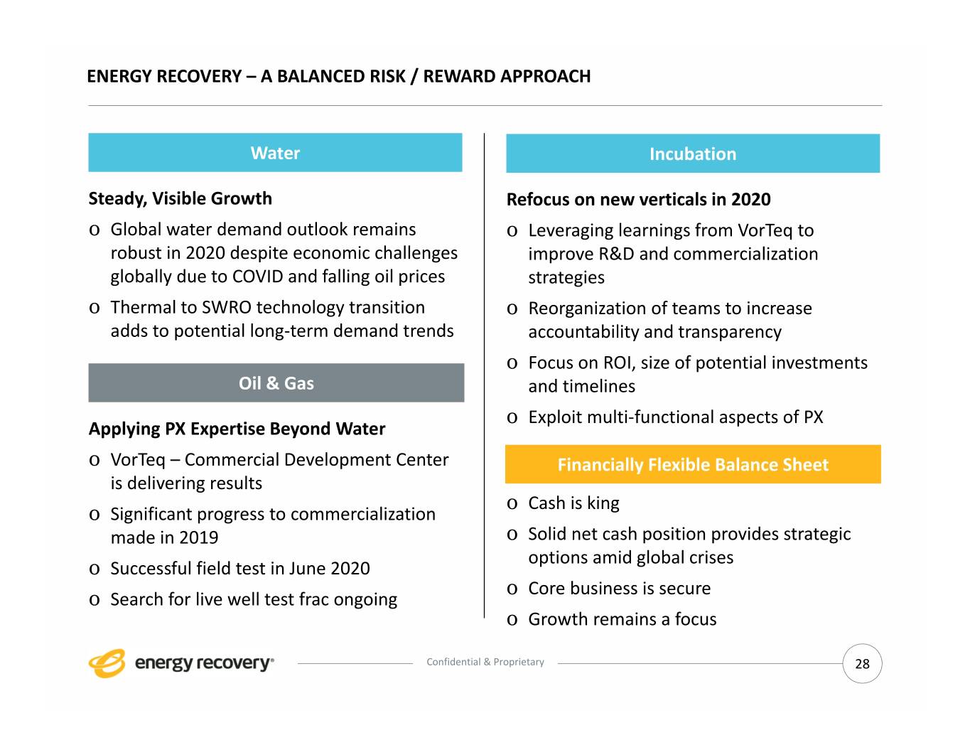 ENERGY RECOVERY – A BALANCED RISK / REWARD APPROACH Water Incubation Steady, Visible Growth Refocus on new verticals in 2020 o Global water demand outlook remains o Leveraging learnings from VorTeq to robust in 2020 despite economic challenges improve R&D and commercialization globally due to COVID and falling oil prices strategies o Thermal to SWRO technology transition o Reorganization of teams to increase adds to potential long‐term demand trends accountability and transparency o Focus on ROI, size of potential investments Oil & Gas and timelines o Exploit multi‐functional aspects of PX Applying PX Expertise Beyond Water o VorTeq – Commercial Development Center Financially Flexible Balance Sheet is delivering results o Cash is king o Significant progress to commercialization made in 2019 o Solid net cash position provides strategic options amid global crises o Successful field test in June 2020 o Core business is secure o Search for live well test frac ongoing o Growth remains a focus Confidential & Proprietary 28