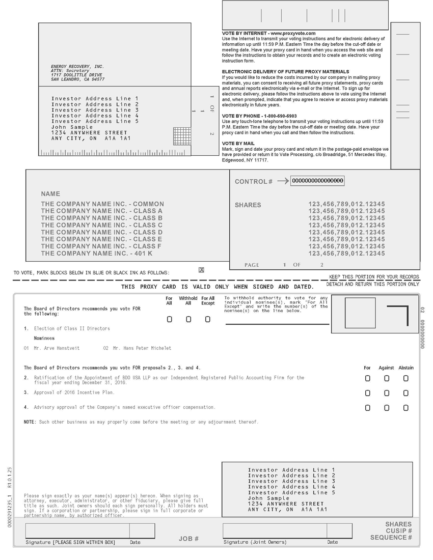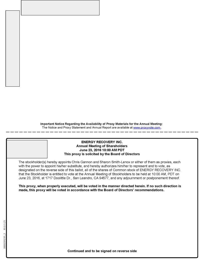 The 2016 Annual Meeting of Stockholders of Energy Recovery, Inc., a Delaware corporation (the “Company” or “Energy Recovery”), will be held on Thursday, June 23, 2016, at 10:00 a.m. Pacific Daylight Time. The 2016 Annual Meeting will take place at the Company’s headquarters, located at 1717 Doolittle Drive, San Leandro, CA 94577.
